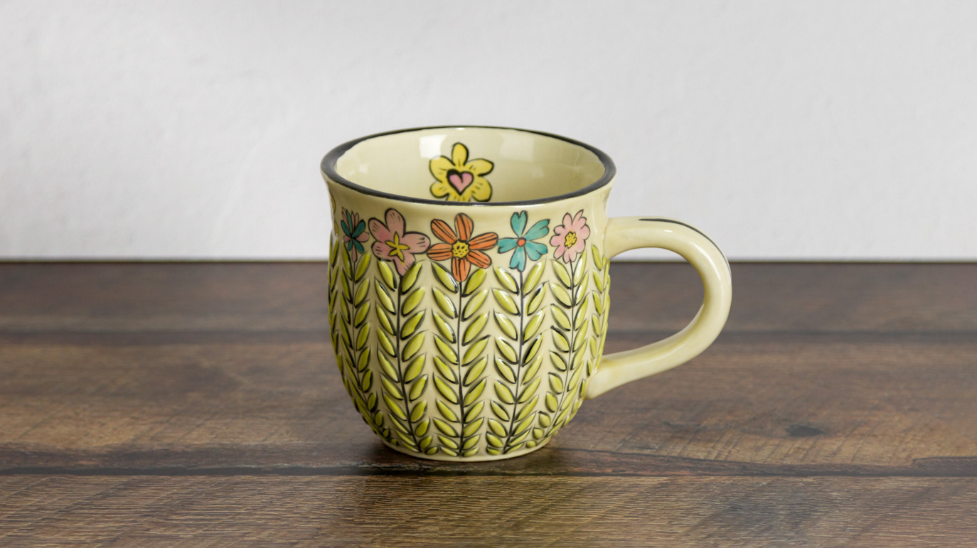 Using the Detail Liner with SC-15 Tuxedo, outline the leaves and flowers. Add decorative lines or dots to the flowers. Add a line going down the handle of the mug.
