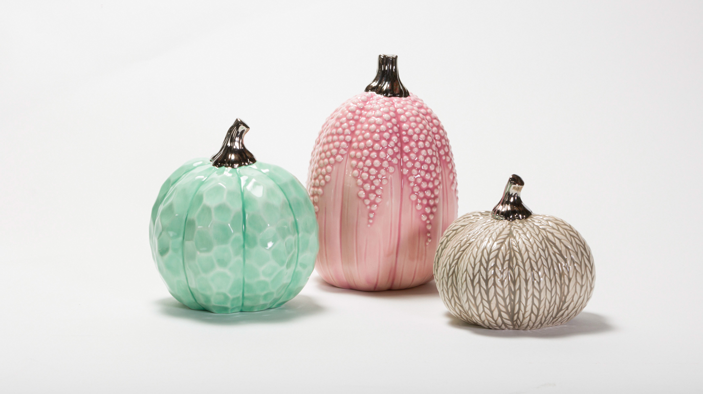 Using the Soft Fan with FN-216 Sea Glass, apply 3 coats to the large pumpkin. Allow glaze to dry between coats.