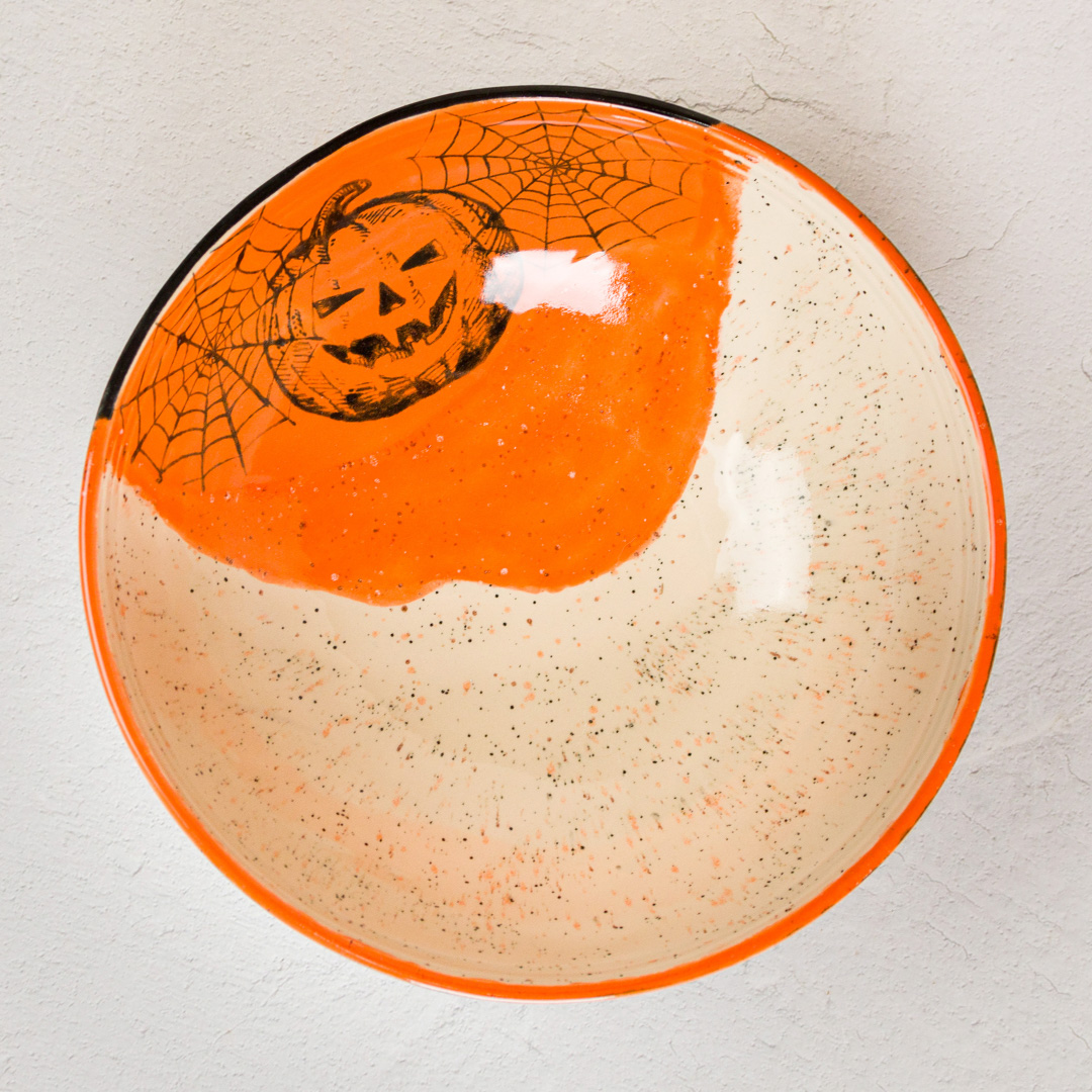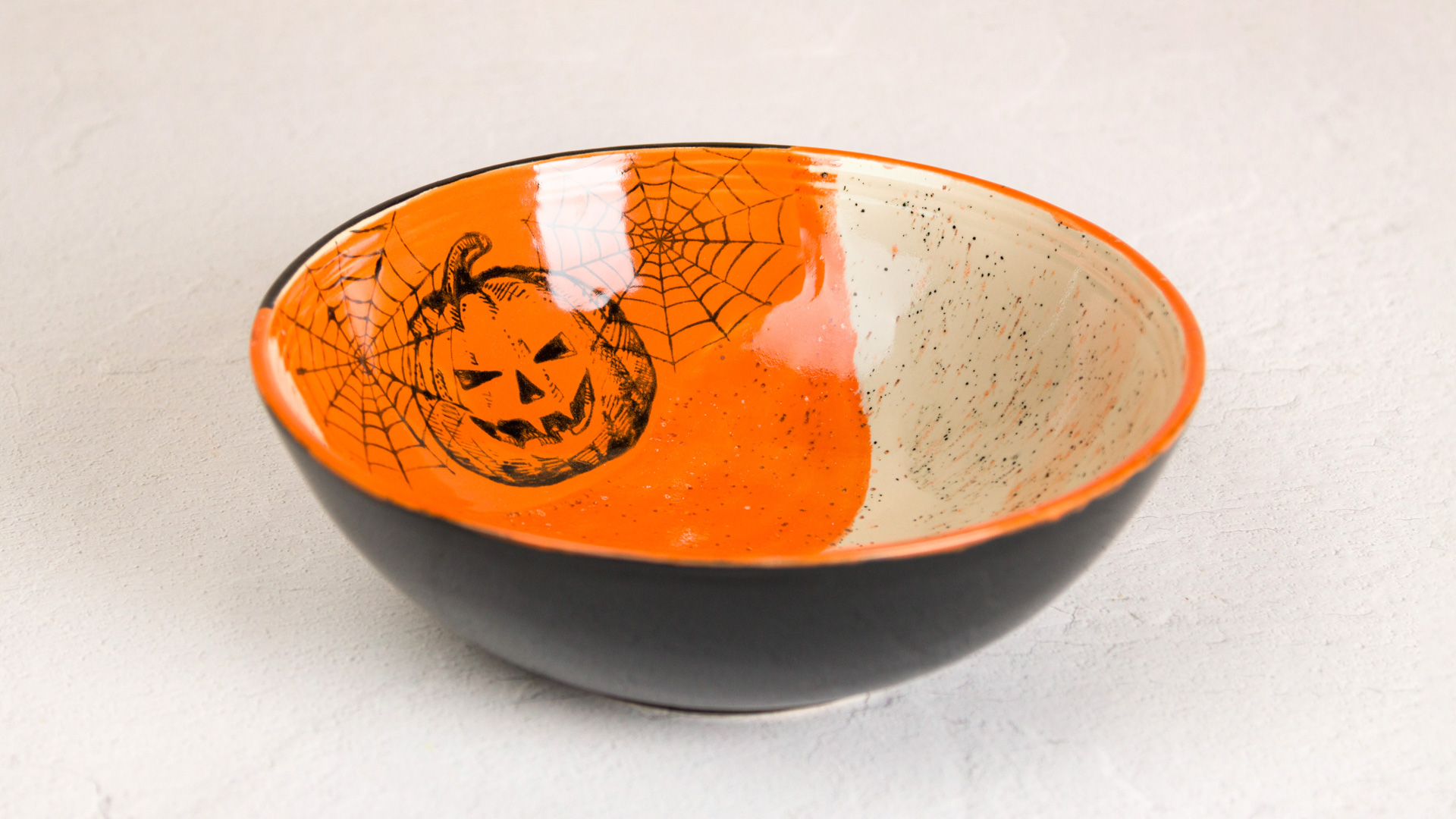 6. Using your finger, apply mixed silkscreen to the pumpkin and cobwebs silkscreen inside the bowl.