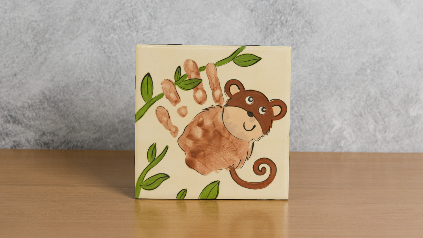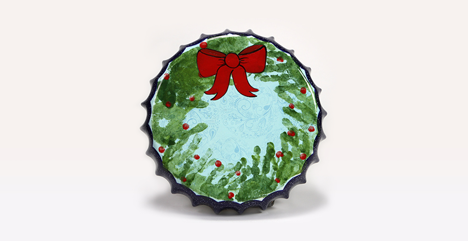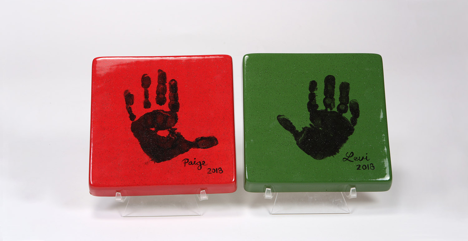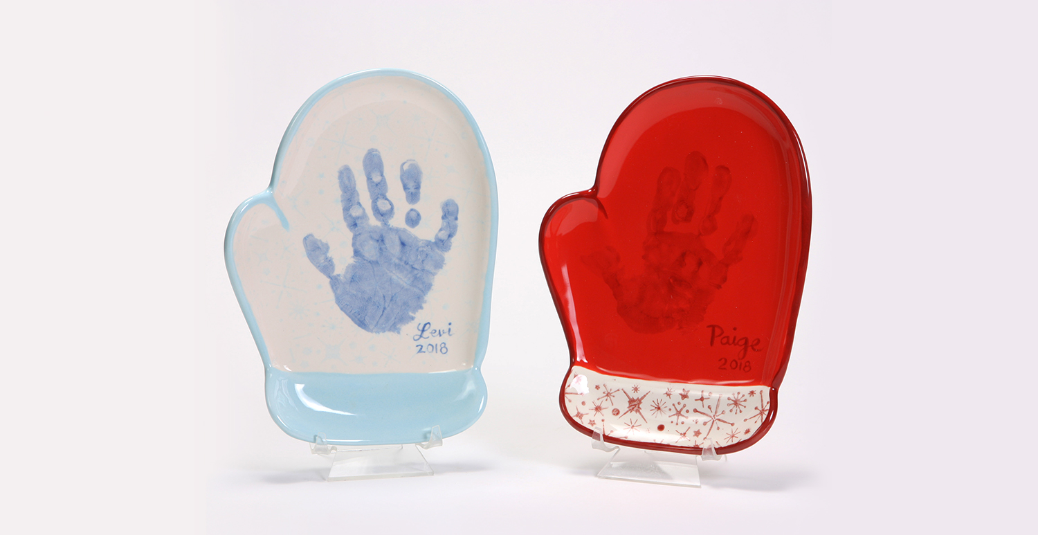 3. Squeeze about two tablespoons of SC-76 Cara-Bein Blue onto the plate. Take the sponge on a stick and gently dab into the glaze. Sponge onto the inside of the child’s hand. Repeat until it is covered. Press the hand onto the mitten. Slowly lift the hand off to avoid smearing. Allow the handprint to dry completely.