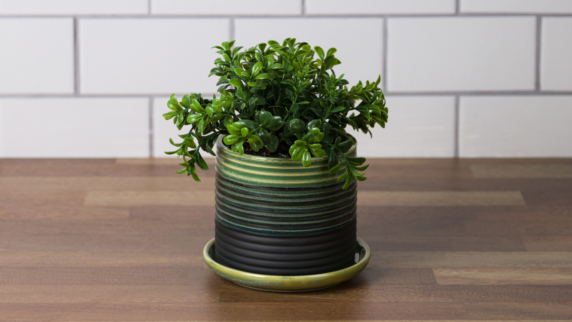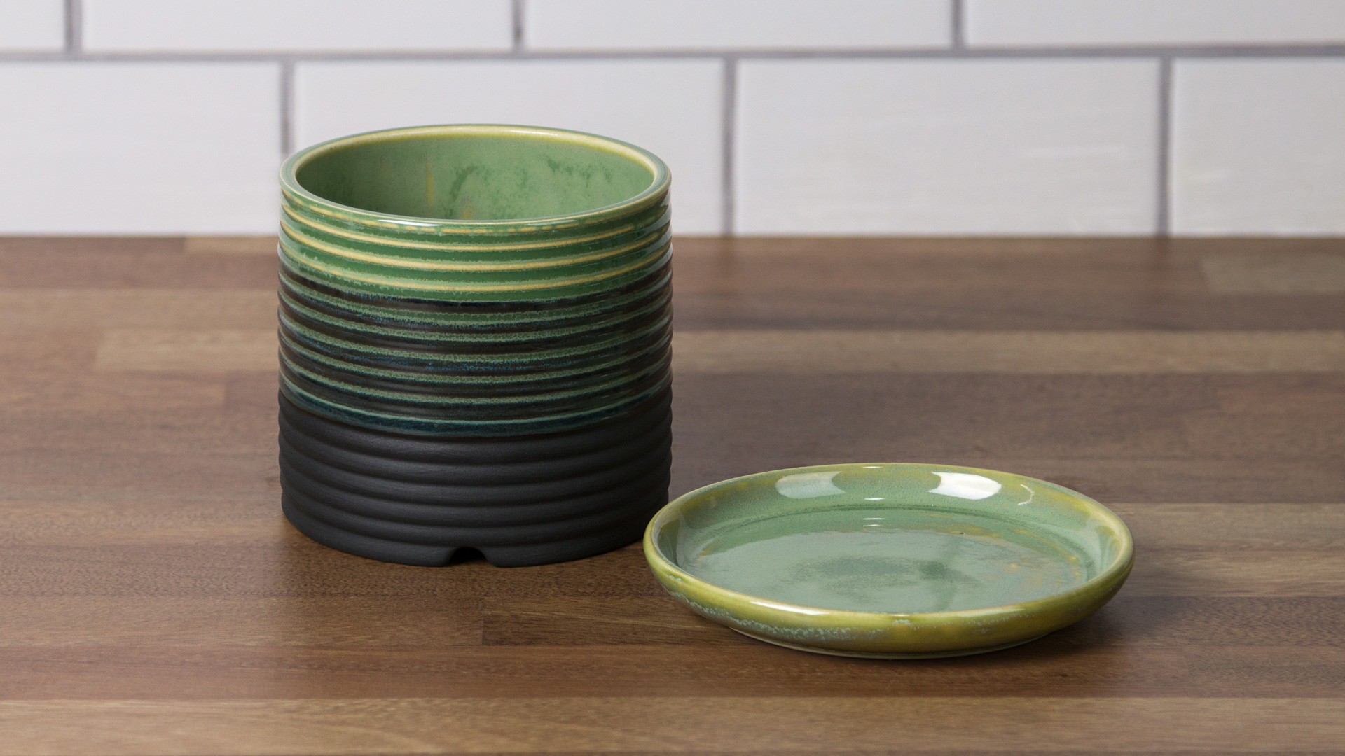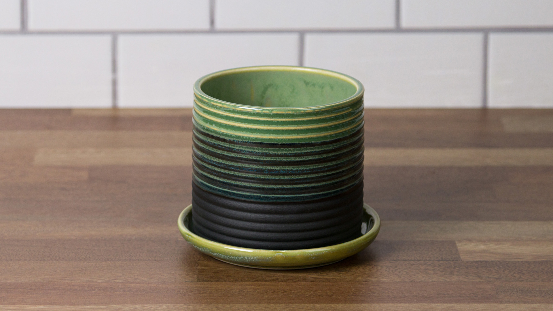 When engobe is dry, using a #4 soft fan brush (RB144) apply 3 coats of SW193 Ivy to top ½ of the planter, overlapping the Black Engobe.