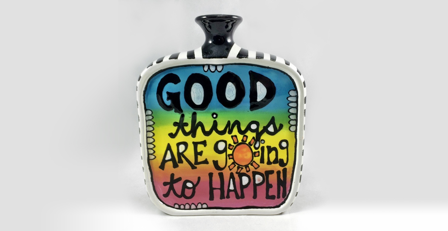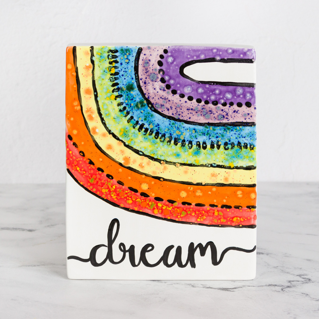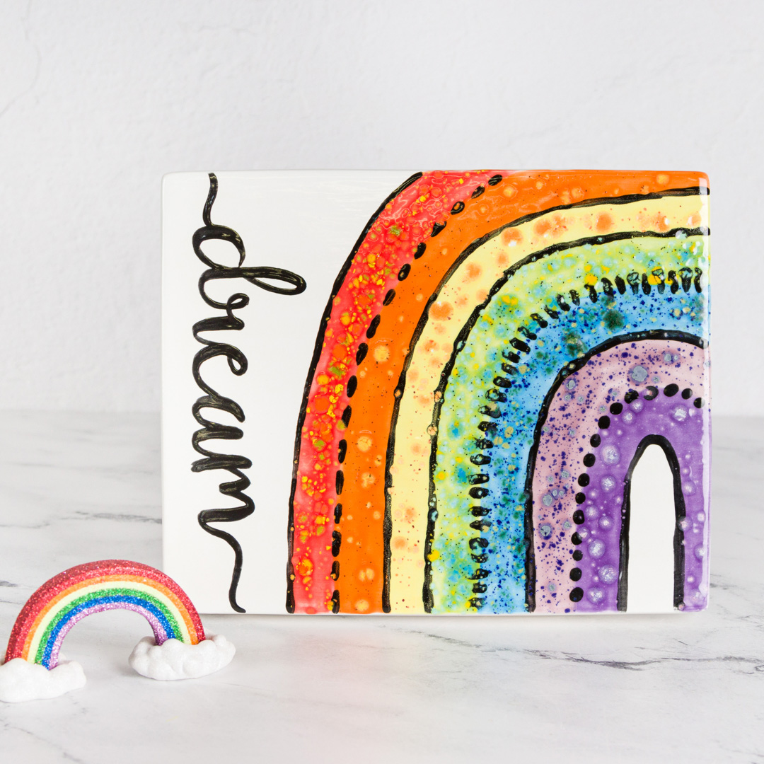 4. Using the Script Liner with CG-756 Firecracker, CG-954 Wildfire, S-2729 Citrus Splash, CG-979 Meadow, CG-718 Blue Caprice, S-2703 Berryberry Pie and S-2723 Grape Divine, apply 2 coats to each section of the rainbow. Allow glaze to dry between coats.
