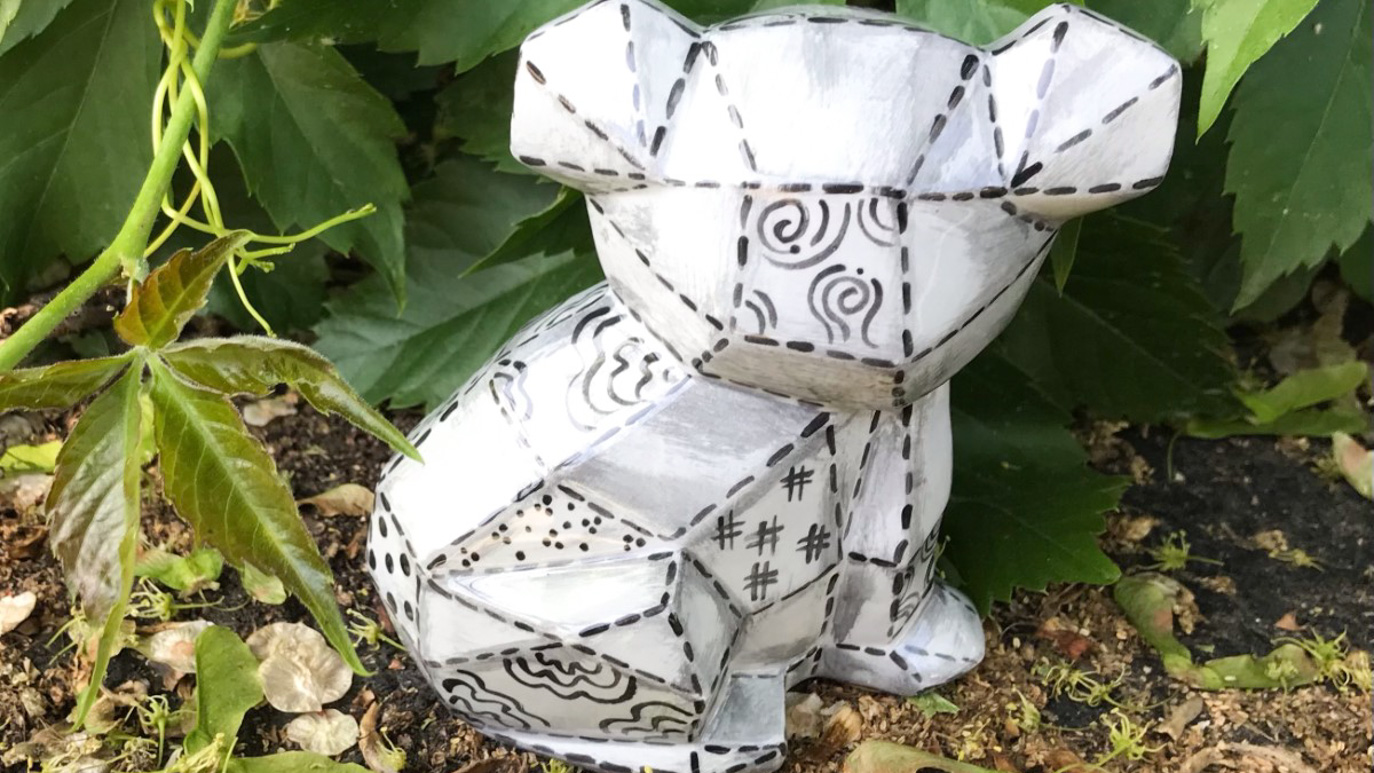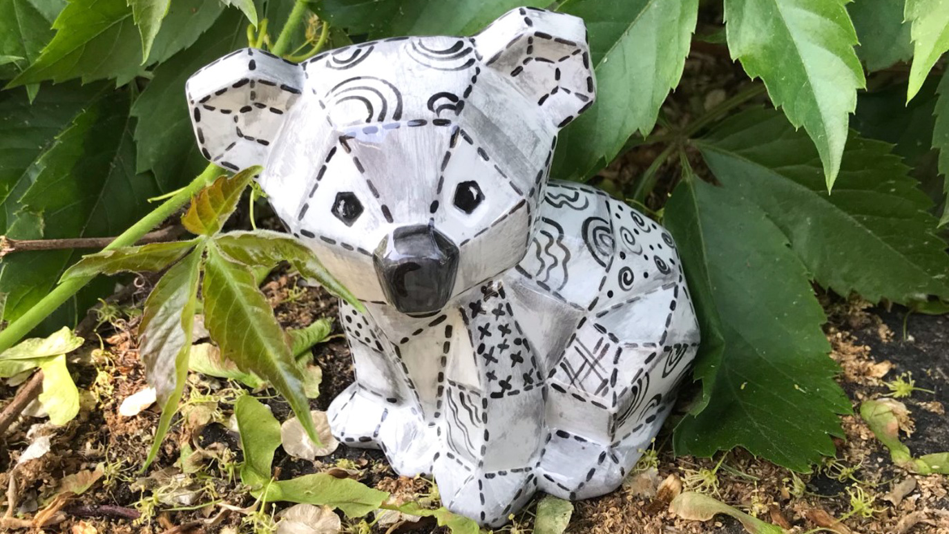 Using the RB-104 #4 Liner with SC-15 Tuxedo, apply one coat of dashes along the facets. Randomly add squiggles, x’s, waves and other fun designs to different areas of the koala.