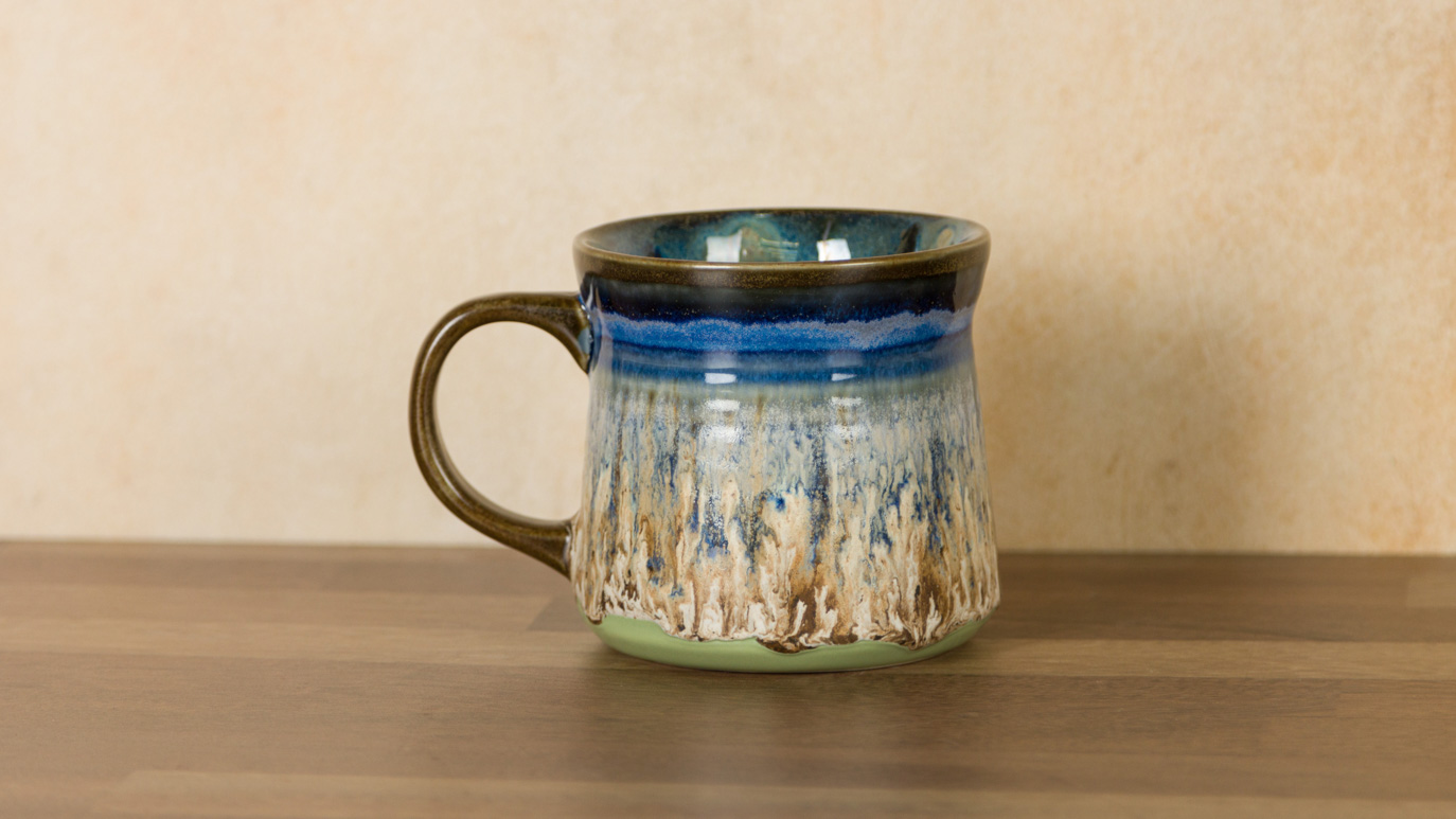5. Use a soft fan brush to apply heavy slaps and drizzles of SW-155 Winter Wood onto the unglazed upper section of the outside of the cup. Tilt and shake the piece to control movement and direction of drips.