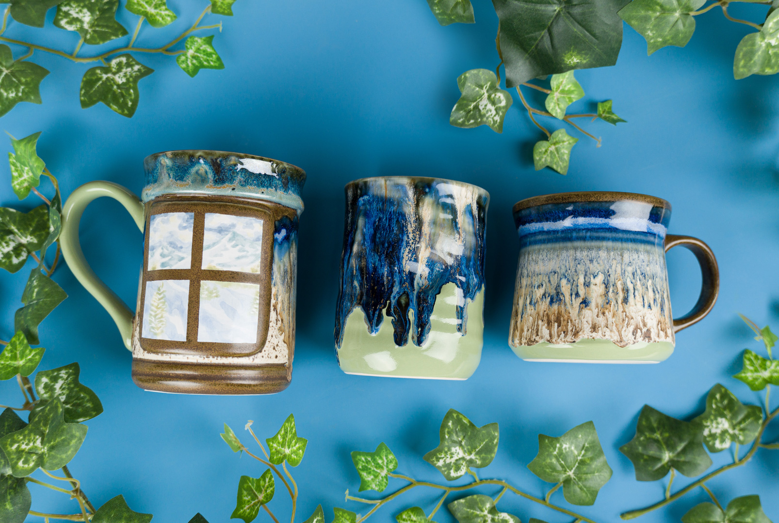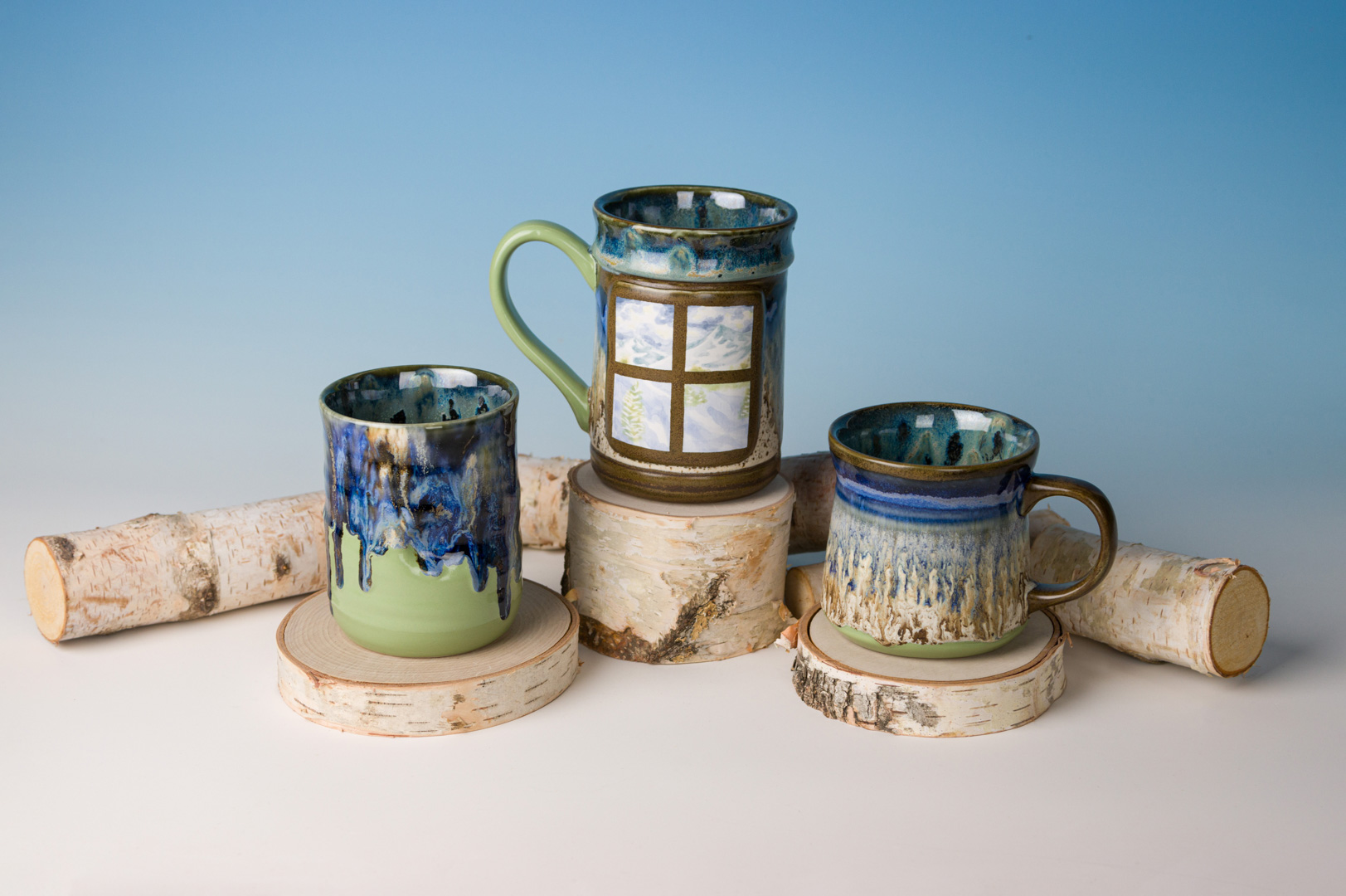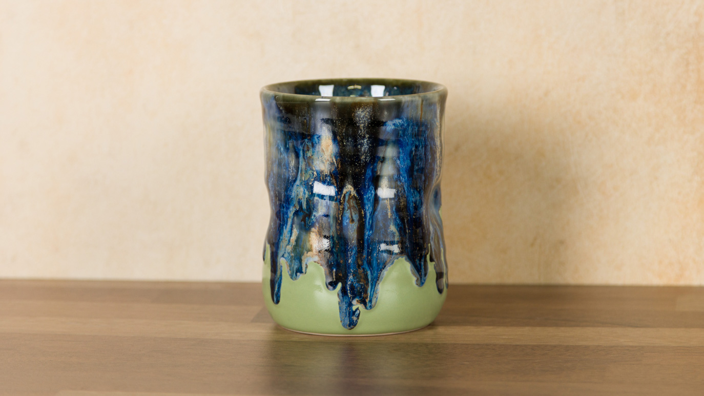 12. Apply 2 coats of SW-149 Aurora Green on top of the SW-144 Lava Rock on the lip and in the inside of the cup. * If you do not wish for this glaze combination to drip onto the body of the piece, recede the coats of SW-146 Aurora Green and brush away any large crystals on the *