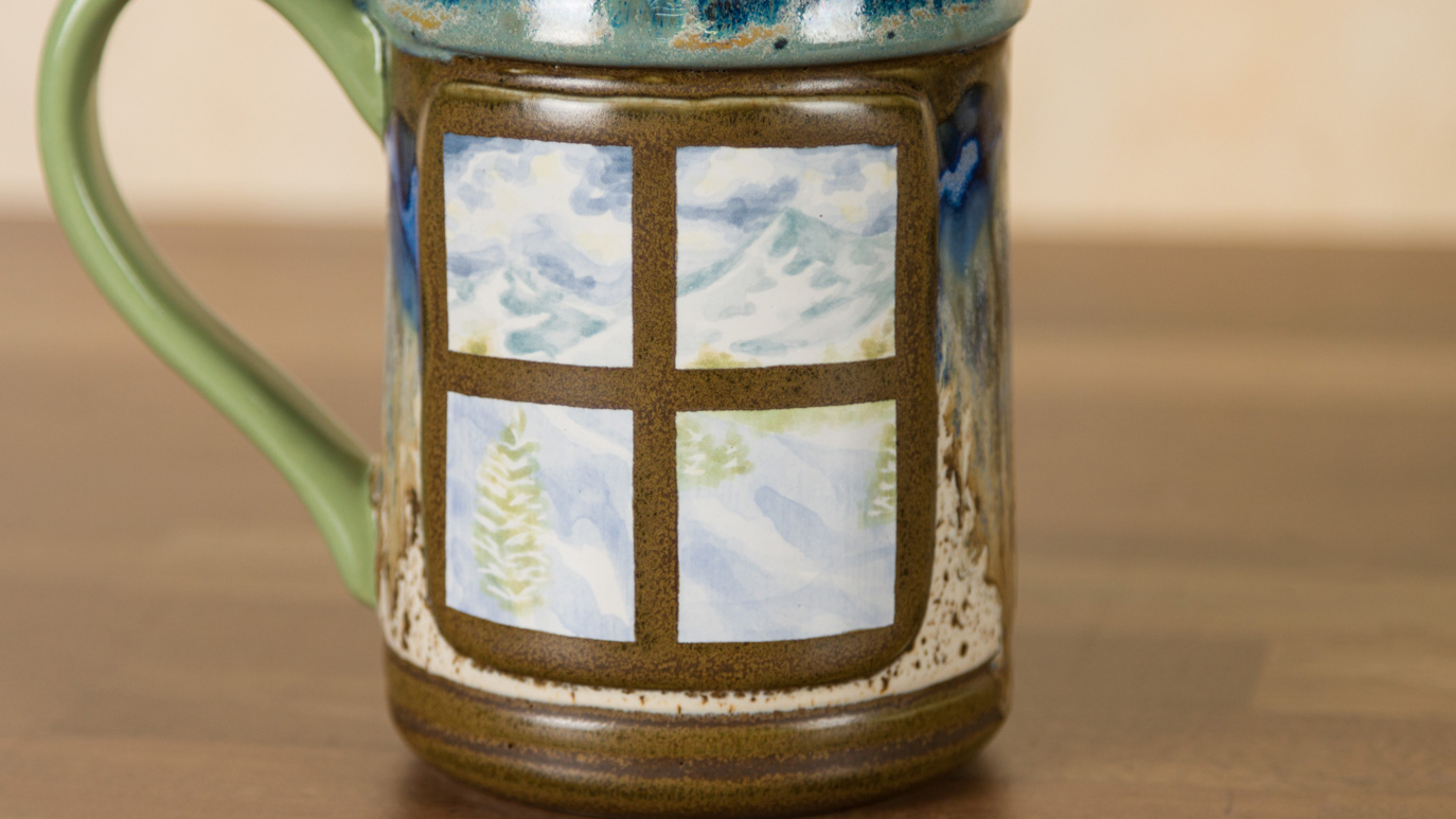 7. When fully dry, apply a careful coat of wax resist over the entire window, handle, and foot of the piece with a flat shader brush and dry completely. Wash brush immediately. For crisp edges, wipe away any glaze that is not protected by wax.