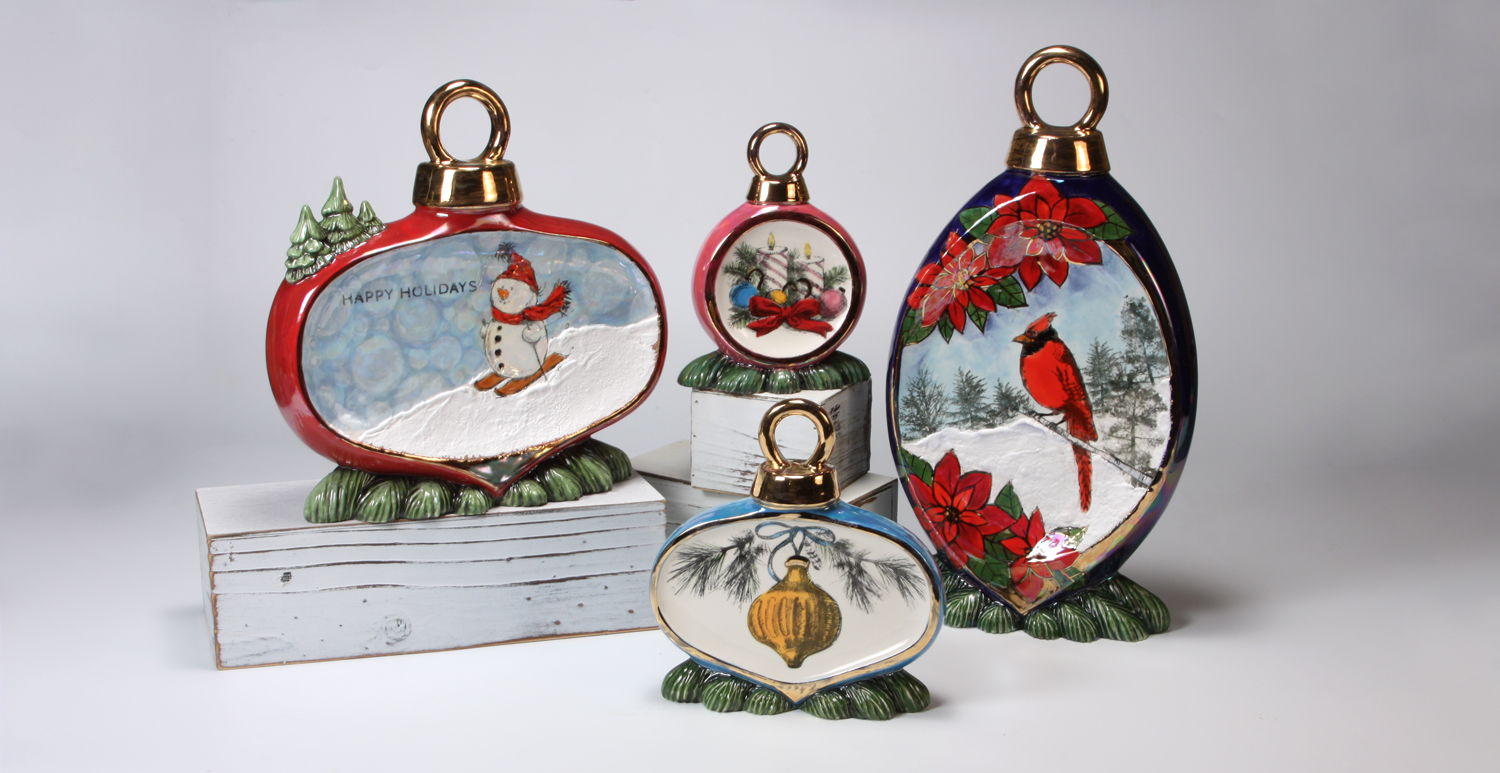 10. Apply SG-302 Snowfall to the snow areas of the Cardinal bulb and the skiing snowman, apply with a brush or palette knife, build up the heavier areas for drifts.