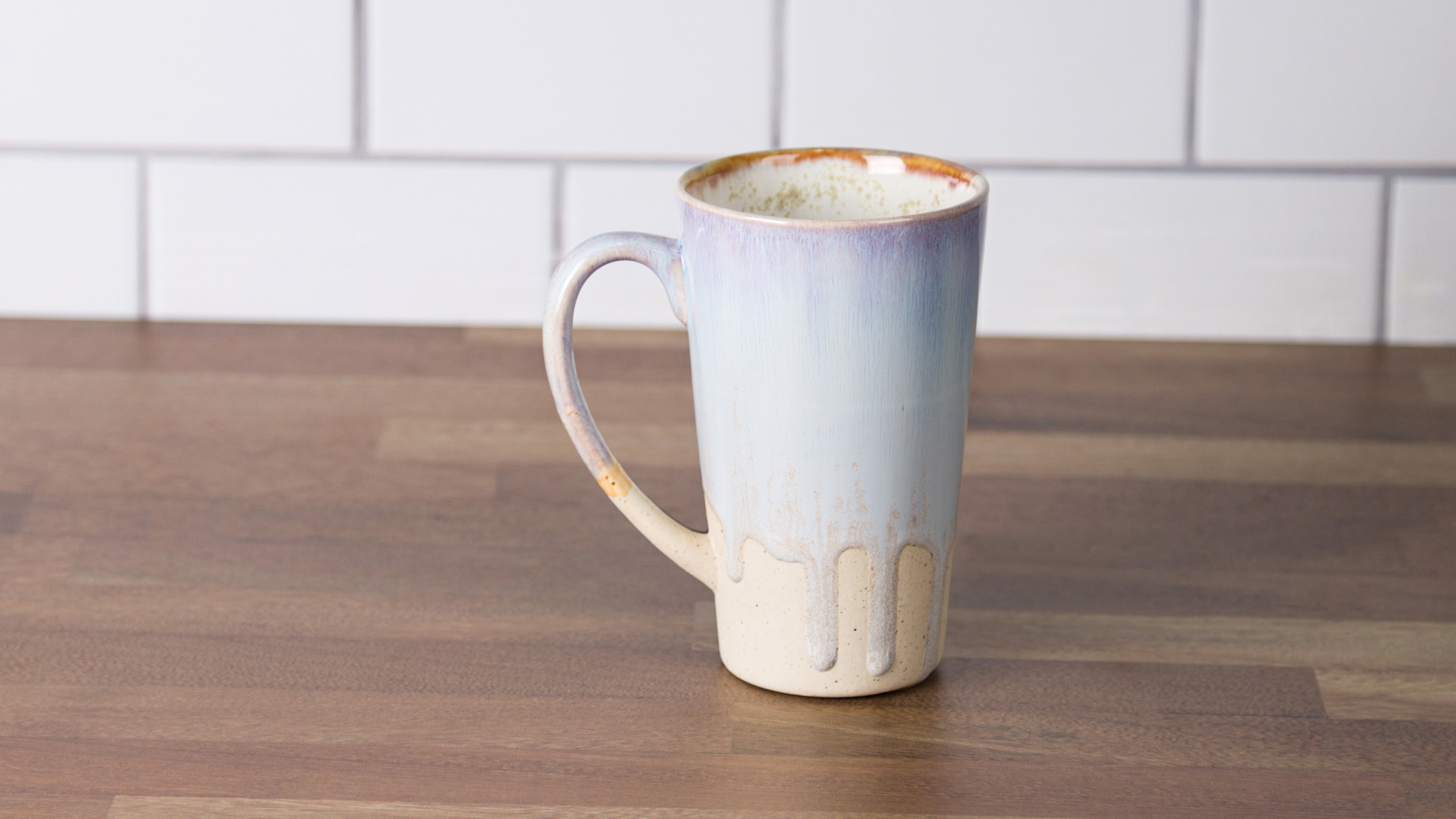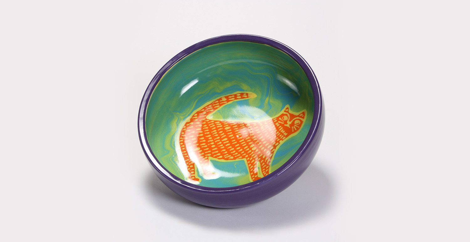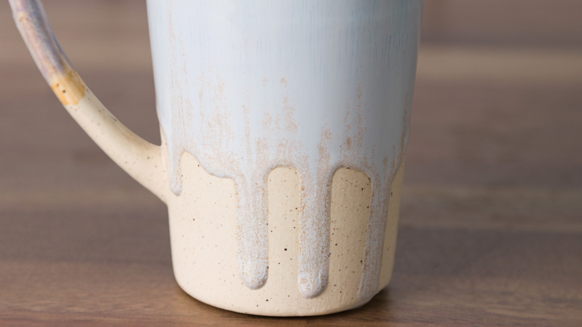 When engobe is dry, using a #4 soft fan brush (RB144) apply 3 coats of SW165 Lavender Mist to the outside of the mug, overlapping the engobe by about 2” including the handle.
