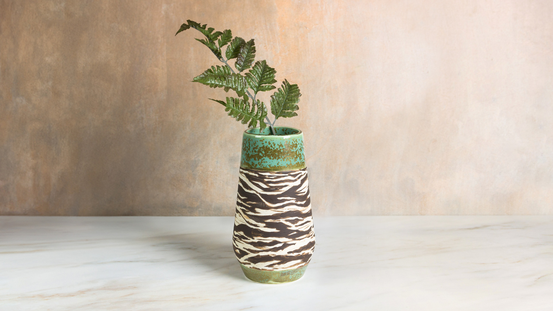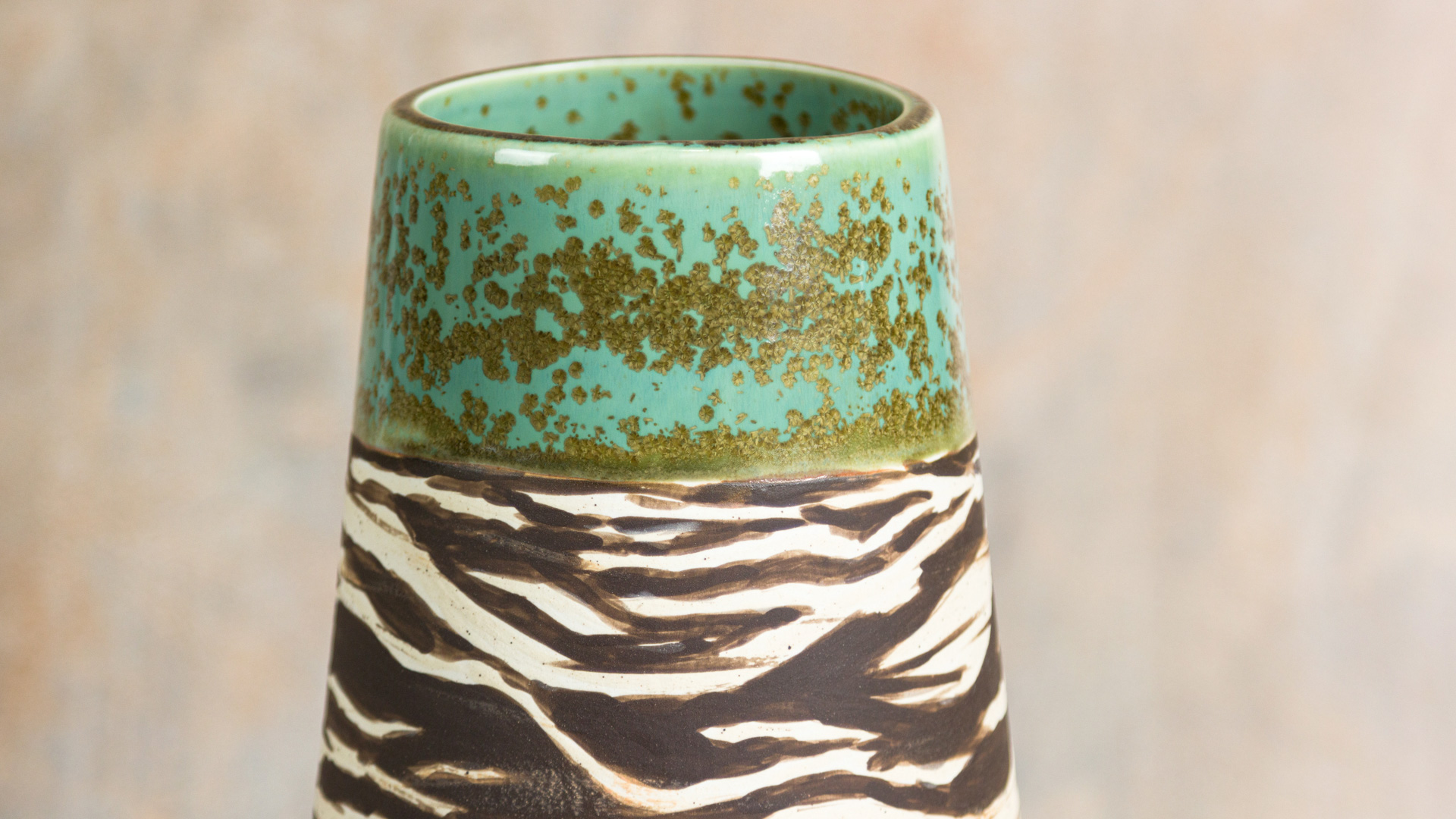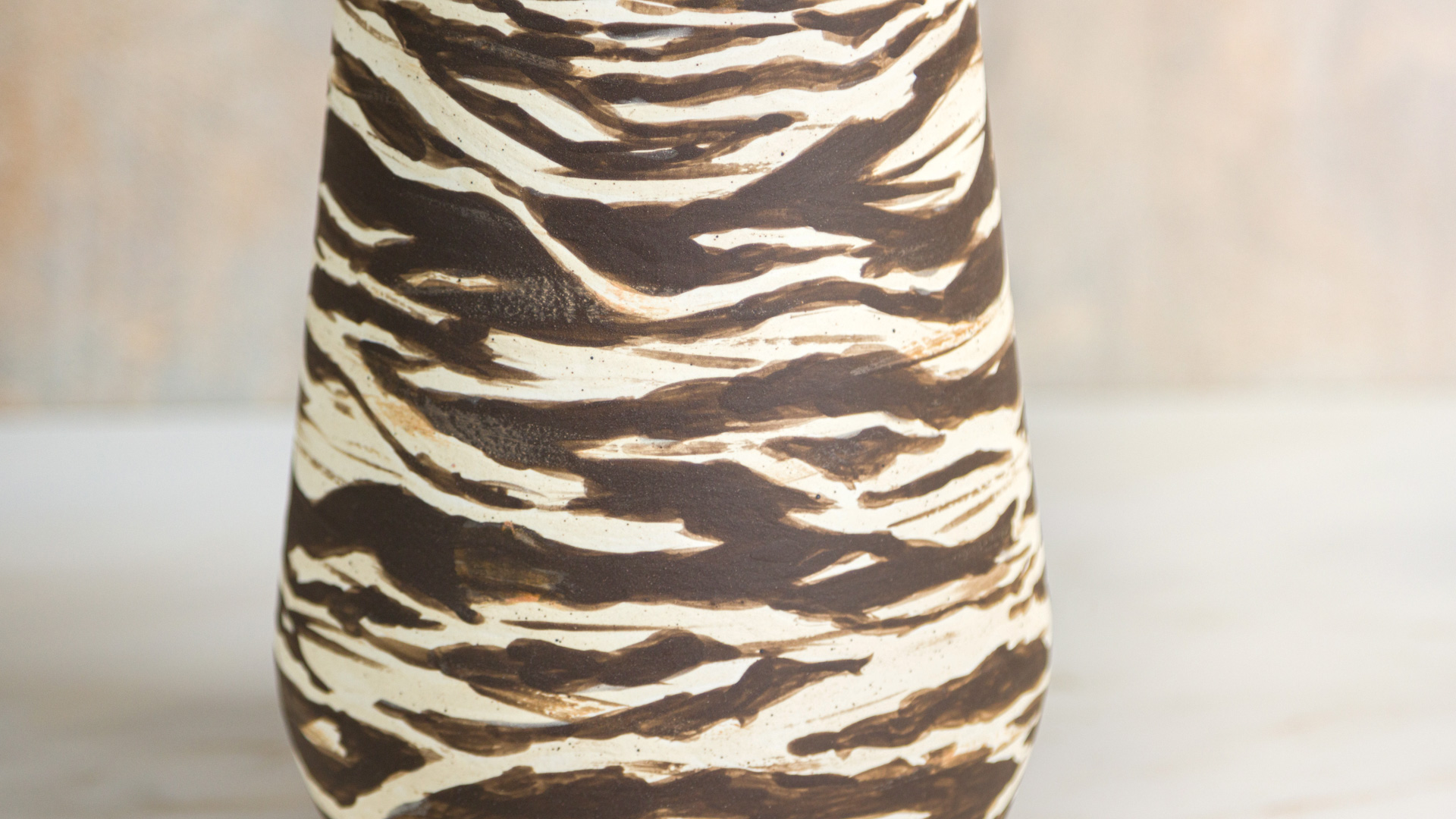 With a #6 round brush (RB116) apply random lines and patterns of EG002 Speckled Buff Engobe and EG004 Dark Brown Engobe to body of the vase, creating the camo effect.