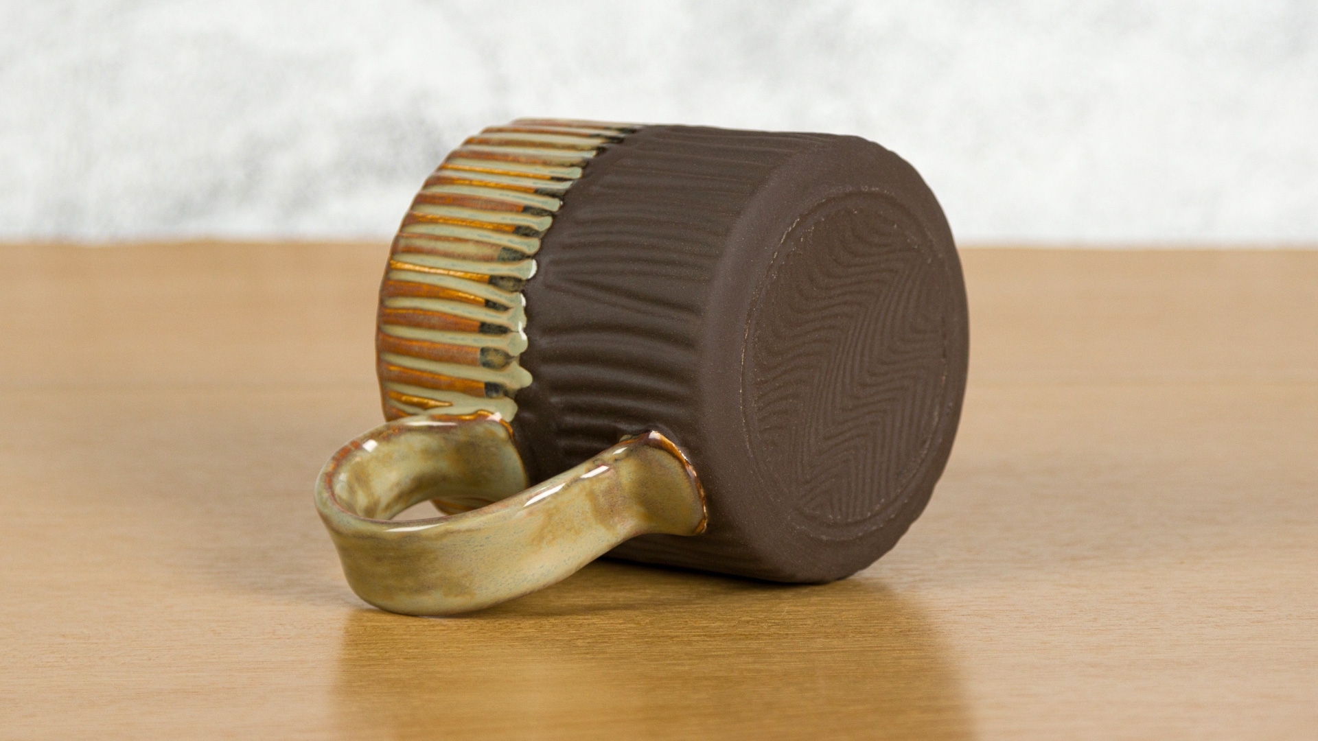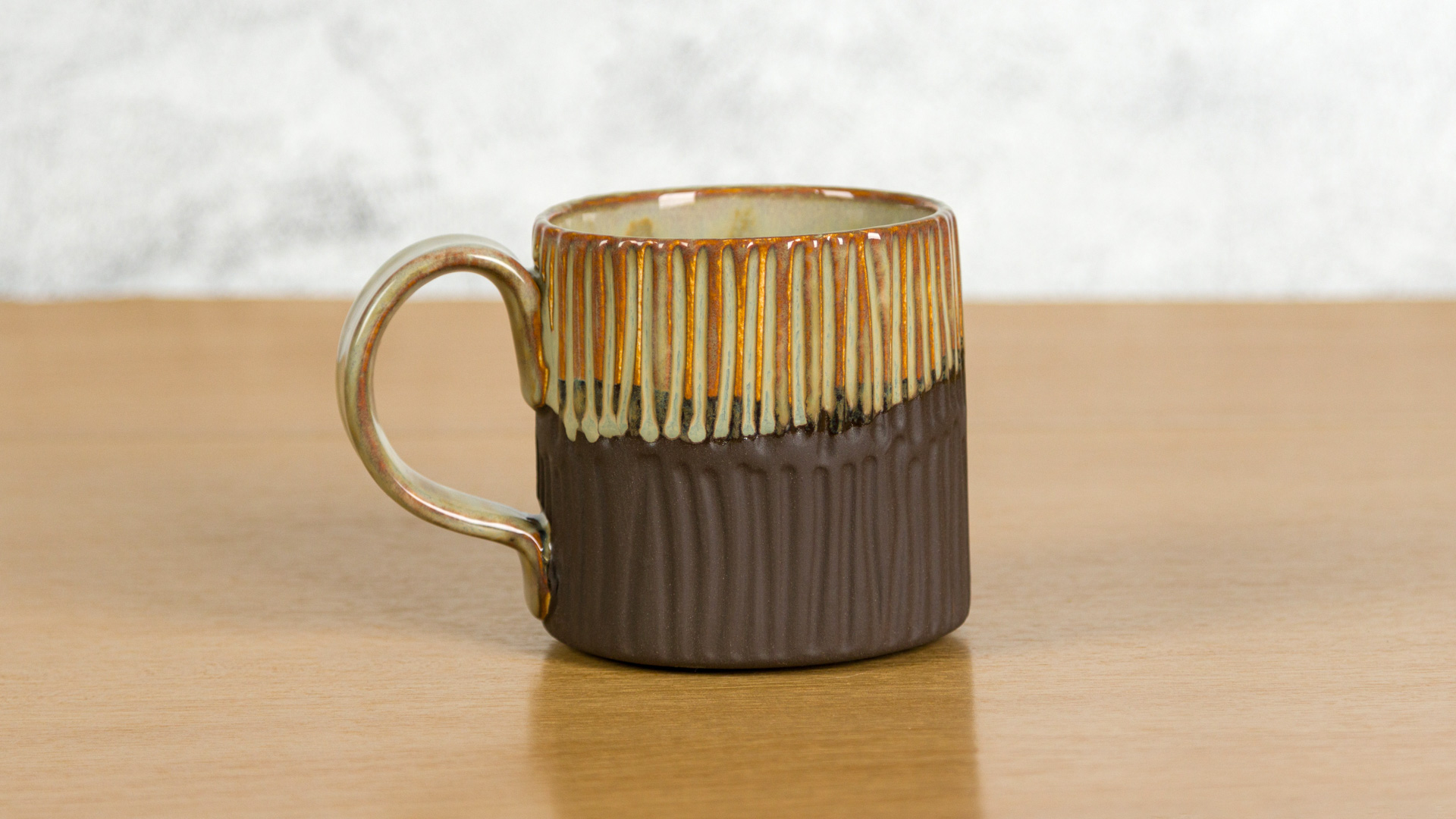 Using a #4 soft fan brush (RB144) apply 2 coats of EG004 Dark Brown Engobe to the bottom 2/3 of the mug.
