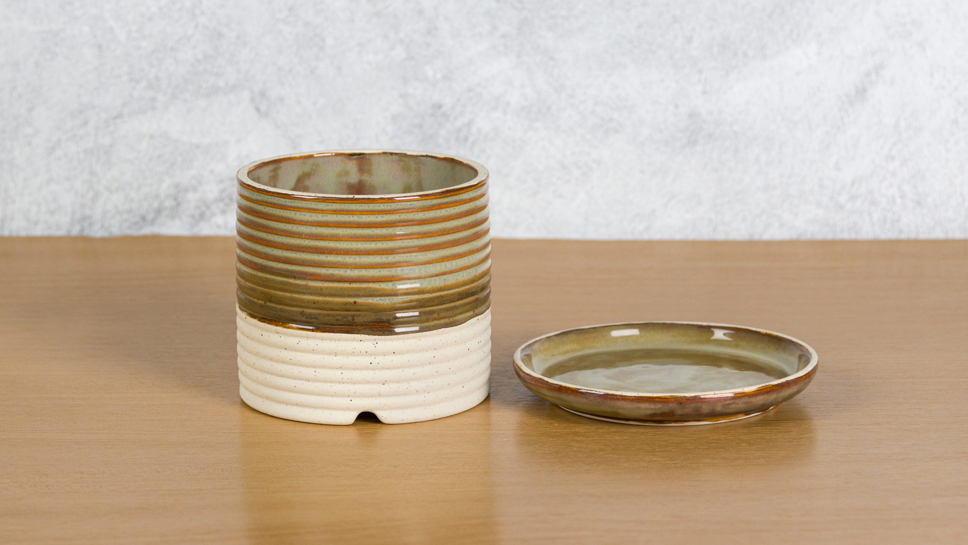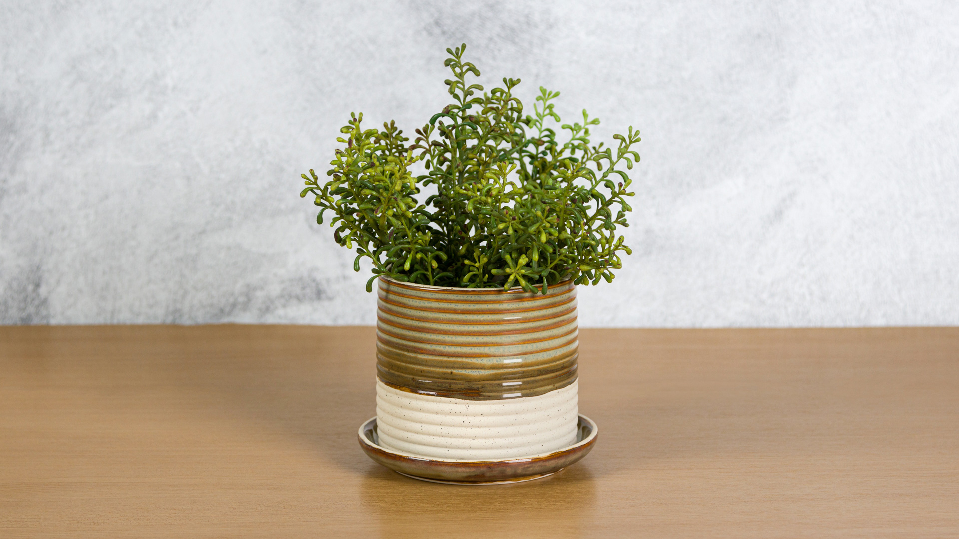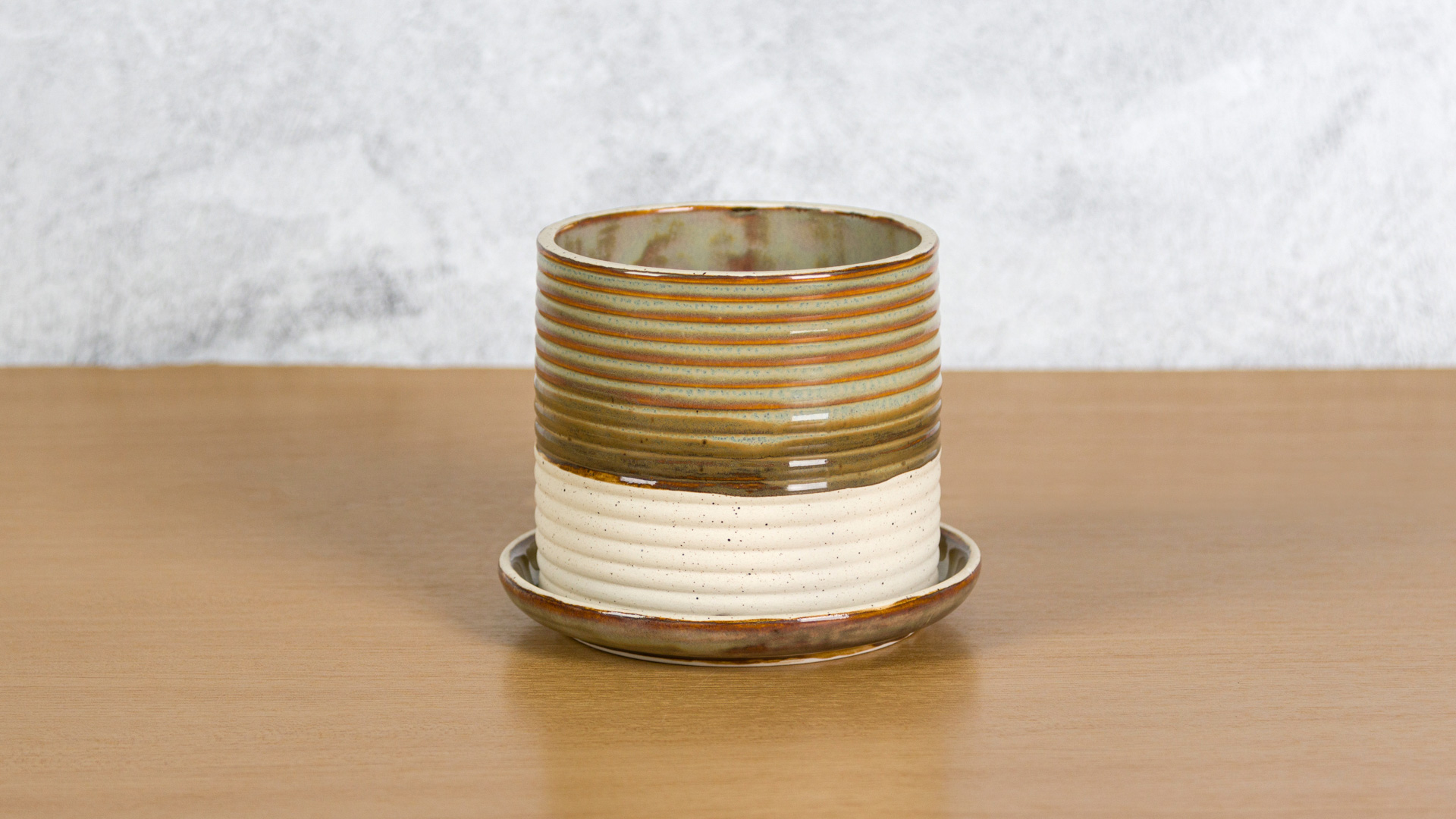 Using a #4 soft fan brush (RB144) apply 2 coats of EG002 Speckled Buff Engobe to the bottom 2/3 of the planter.