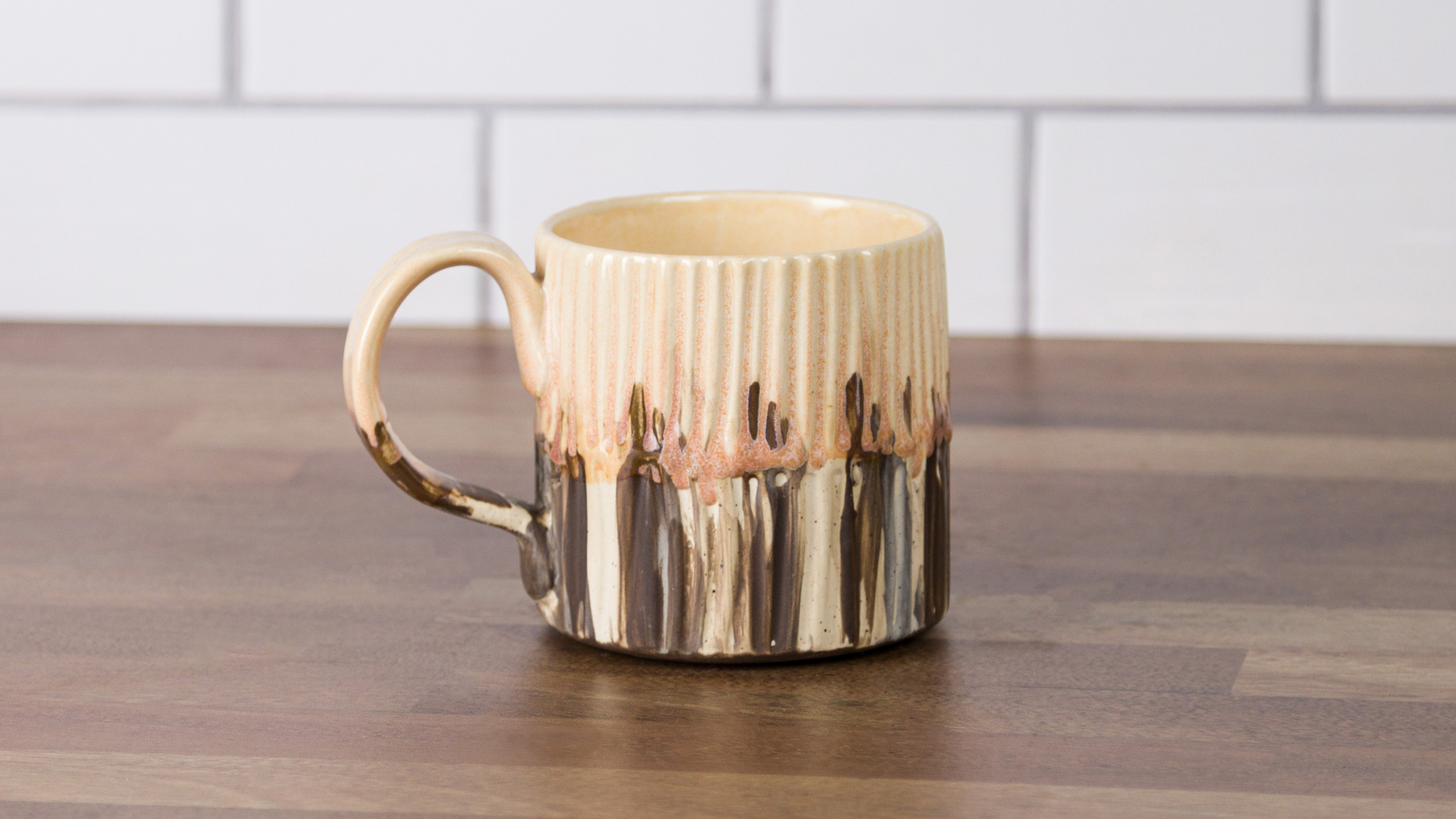 2. Using a #8 Round Brush (RB118) apply random stripes of EG002 Speckled Buff Engobe and EG004 Dark Brown Engobe to the bottom 2/3 of the mug and bottom 2/3 of handle.