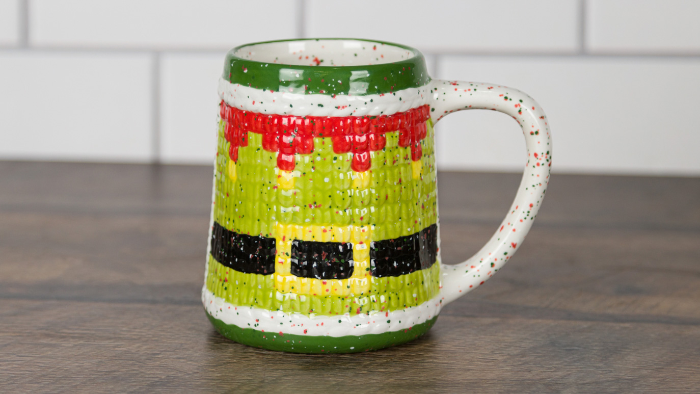 - Use the pencil the outline the pattern onto the inner “stitched” portion of the mug. Refer to the patterns below. The Santa suit will be on one side of the mug and Elf suit will be on the other side.