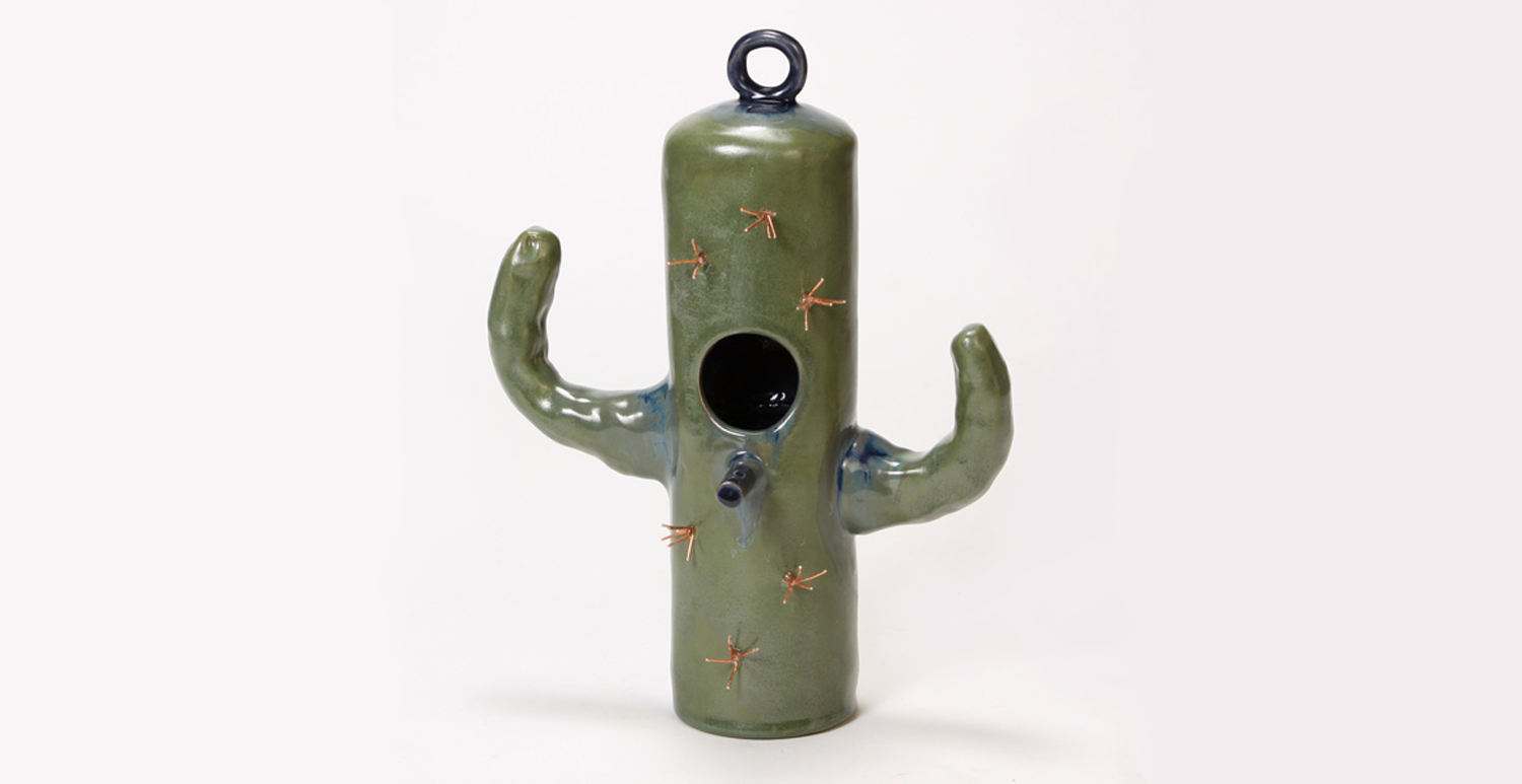 Let it rest so it can be finished. After the clay is firm, cut a hole for the opening of the bird house, poke small holes for the cactus wires, roll a coil for the hanger and the perch. Score and slip attach the perch and coil.