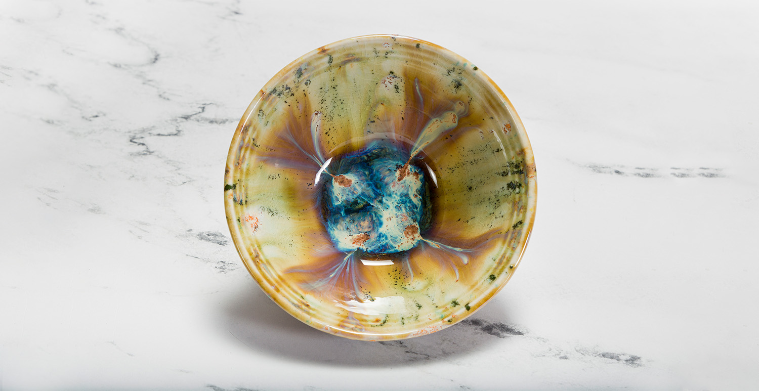 Using the CB-604 Soft Fan Brush, apply 2 coats of the following glazes in a spiral direction according to the pattern. You can leave some uncovered Shipwreck in between sections if you’d like. The order of the colors in the spiral is not important. Make sure you don’t use Dark Flux too close to the bottom of the outside of the bowl or else it may run off the bowl: SW-402 Dark Flux, SW-155 Winter Wood, SW-169 Frosted Lemon, SW-163 Soft Red Matte