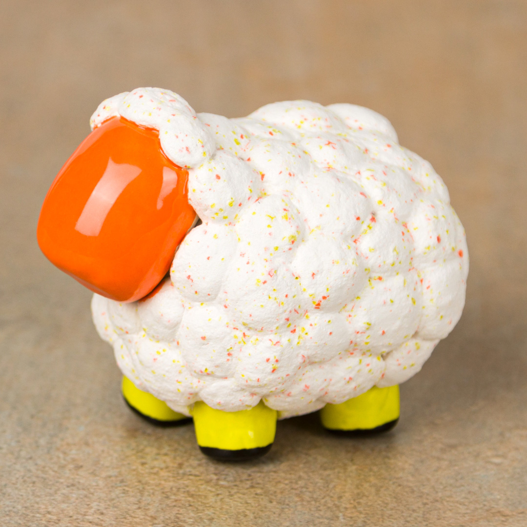 8. For the smallest sheep: Apply three coats of SG303 Citrus Snow Gem to the fluffy part of the body. Using a smaller brush, apply three coats of SC077 Glo-worm to the legs, and three coats of SC075 Orange-a-Peel to the face. Add three coats of SC015 Tuxedo to the hooves.