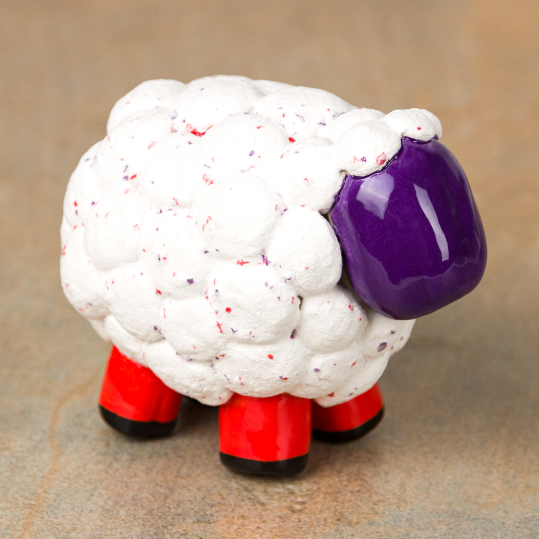 7. For the medium sheep: Apply three coats of SG304 Berry Snow Gem to the fluffy part of the body. Using a smaller brush, apply three coats of SC073 Candy Apple Red to the legs, and three coats of SC033 Fruit of the Vine to the face. Add three coats of SC015 Tuxedo to the hooves.