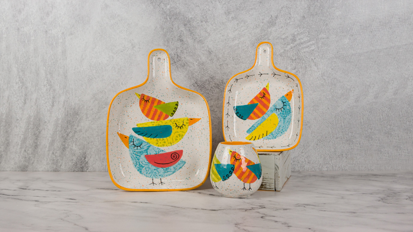 - Using the Script Liner with SC-89 Cutie Pie Coral (large bird), SC-28 Blue Isle (medium bird), and SC-27 Sour Apple (small bird), apply 2 coats to the wings. Allow glaze to dry between coats.