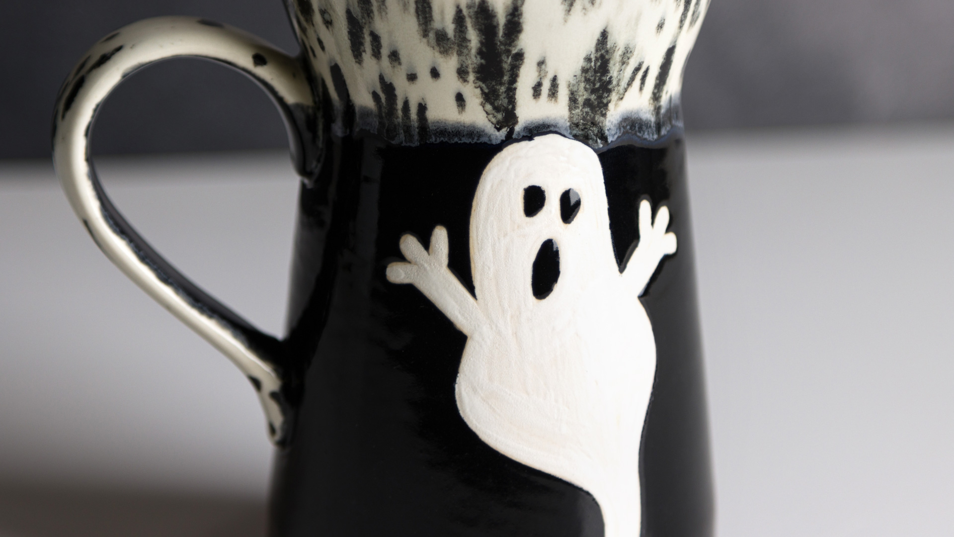 4. With a #8 Soft Fan brush, apply 3 coats of SW508 Black Gloss to the body of the mug, directly over the vinyl resist, or if the resist isn’t being used, gloss around the pencil line of the ghost. You will also apply 2 coats SW508 Black Gloss to the entire inside of the handle and to create the ghost’s eyes and mouth.