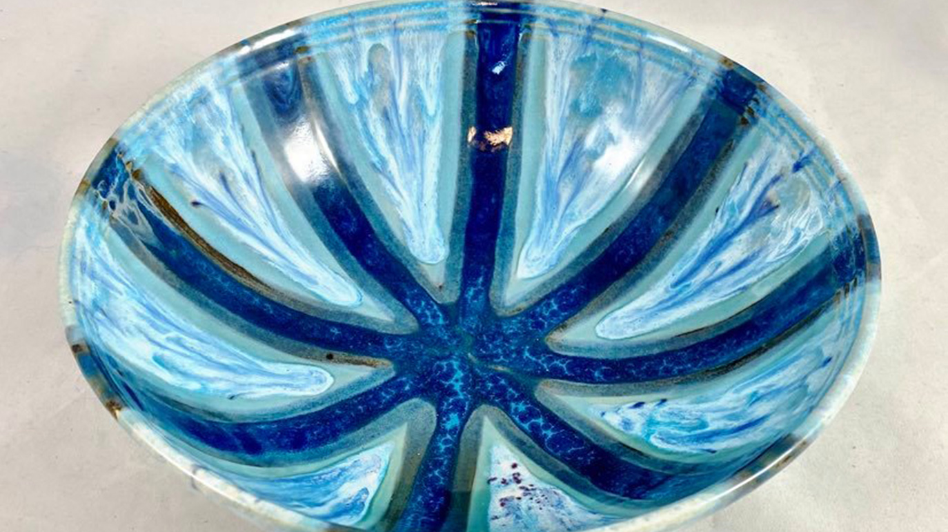 Using the CB-604 Soft Fan Brush, apply 3 coats of SW-166 Norse Blue to the back side of the SW-119 Stoneware Serving Bowl. Make sure not to glaze the bottom of the pie plate and wipe off any glaze that may have gotten on it.