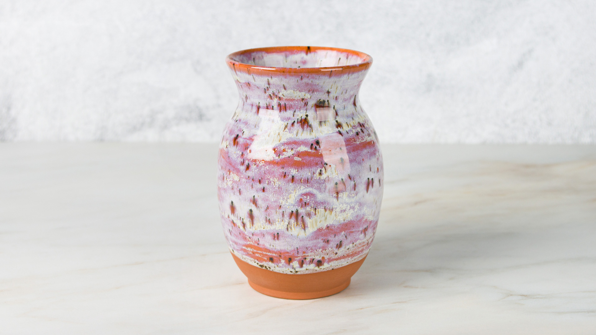 Apply 3 coats of SW-176 Sandstone to a section of the vase. On the sample vase, it was applied to the neck/top and as 3 large teardrop shapes around the vase leaving space in between for glaze trailing.