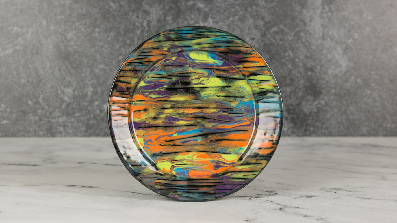 With overloaded fan brushes, randomly drizzle SW-503 Orange Gloss, SW-505 Purple Gloss, SW-506 Bright Blue Gloss and SW-507 Bright Green Gloss over the plate.