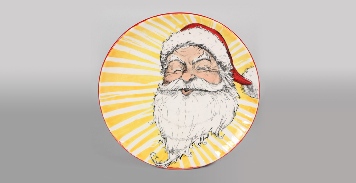 4. Cut out the Santa pattern, brush a coat of water to the plate and place the paper Santa face onto the plate. Use a paper towel to remove excess water and smooth out the paper.
