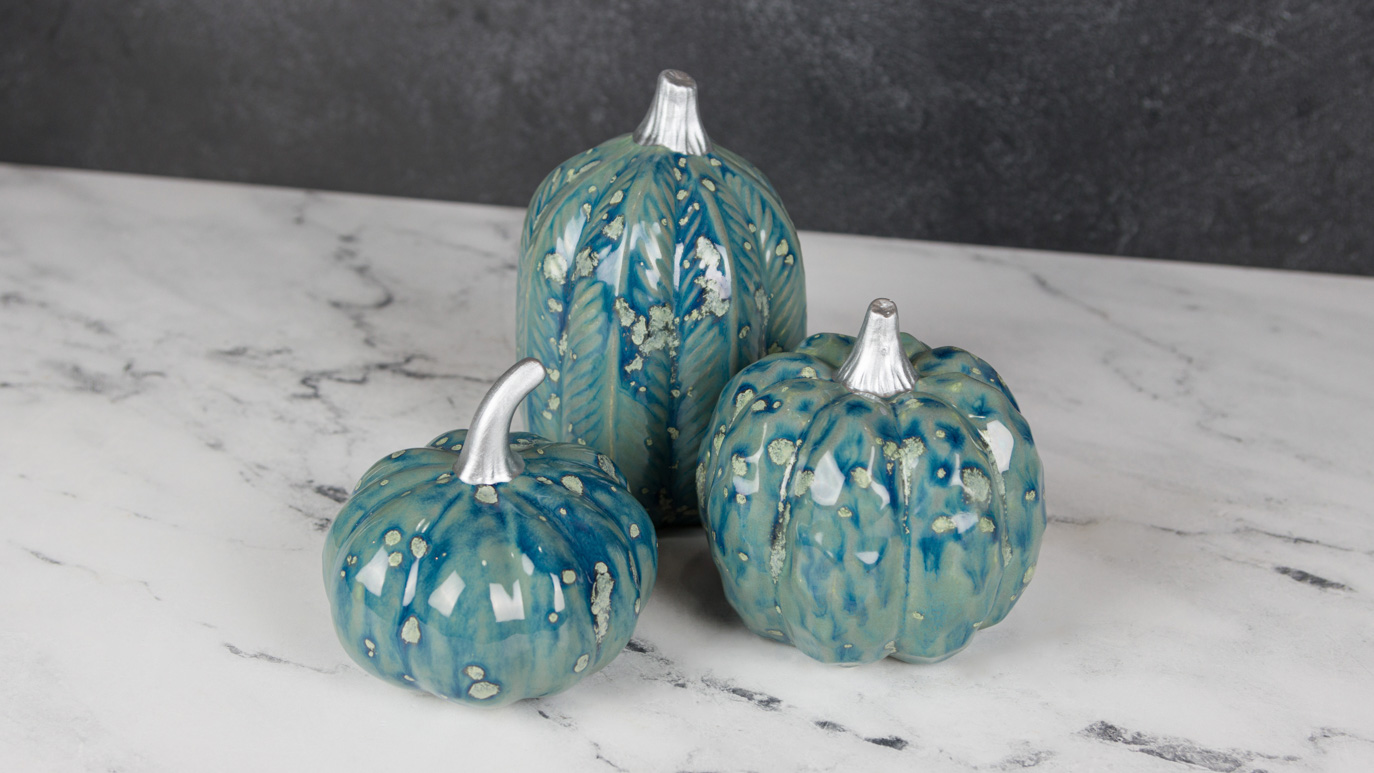 Using the Soft Fan with EL-106 Tidal Pool, apply 2 coats to each pumpkin. Do not glaze the stems. Allow glaze to dry between coats.