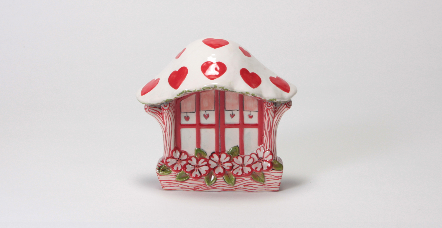 Pencil in window shades in the windows. Use the Liner or Script Liner to apply two thinned coats of SC-89 Cutie Pie Coral to the window shaes. Use the Liner to outline the shades with SC-15 Tuxedo. Create small heart pulls from each shade and outline.