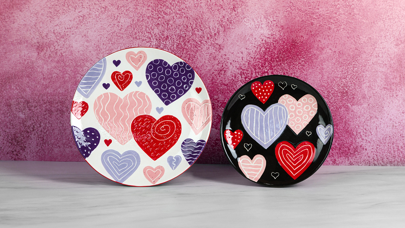 - Using the Script Liner with SC-1 Pink-A-Boo, SC-33 Fruit of the Vine, SC-74 Hot Tamale, SC-103 Lavendear, SP-201 Speckled Pink-A-Boo, and SP-274 Speckled Hot Tamale, apply 3 coats to half of the hearts on the plate. Allow glaze to dry between coats.