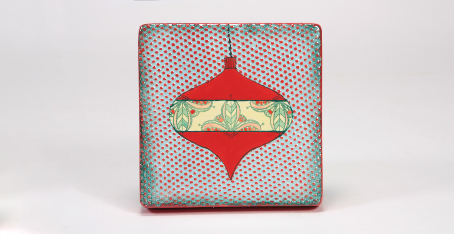 18. Dip the long edge of the plastic card into SC-10 Teal Next Time to create the straight lines that create the sections on the ornament. Dip the card into the color then dab onto paper or a paper towel to check the amount of glaze. Press the edge of card onto your ornament. Alternatively, you may use the Liner to paint your lines.