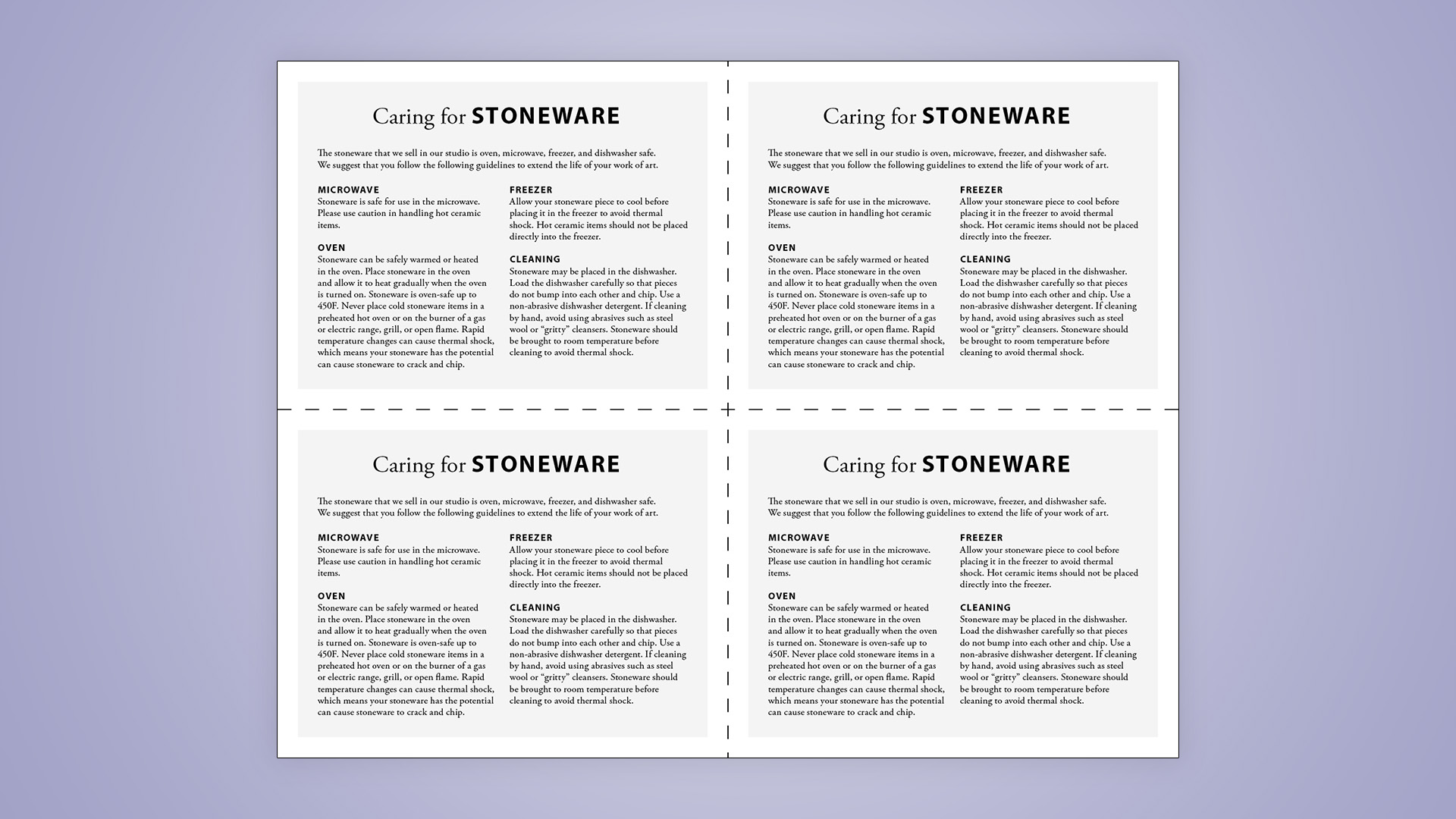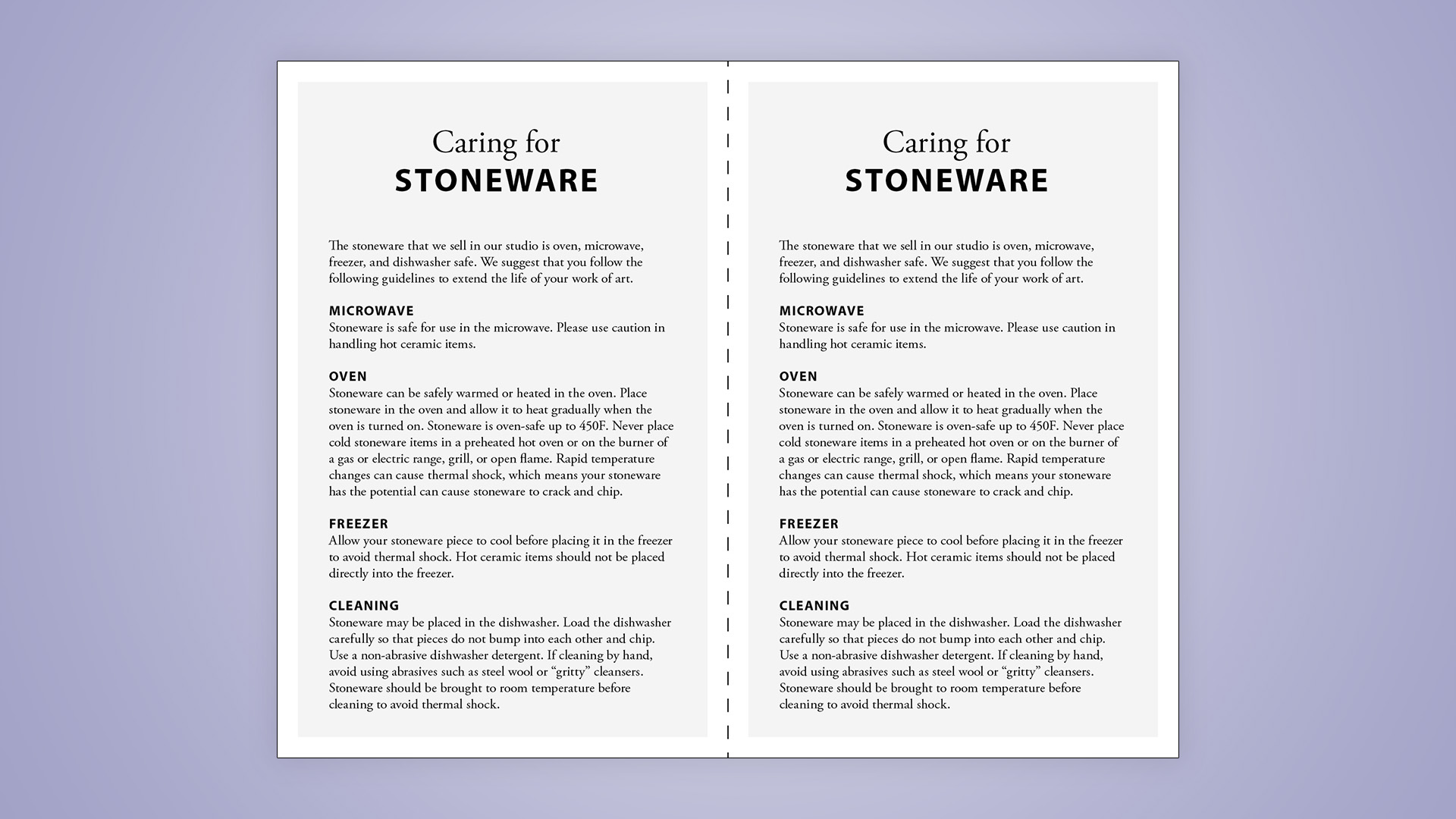 Mayco cares about your studio’s success, but also the customer’s success with Stoneware. We created a Stoneware Care card for your Stoneware customers to ensure customer satisfaction and be sure their artwork lasts for years to come.