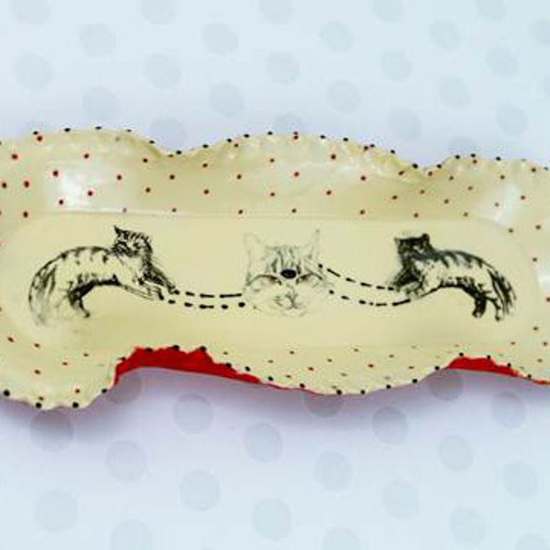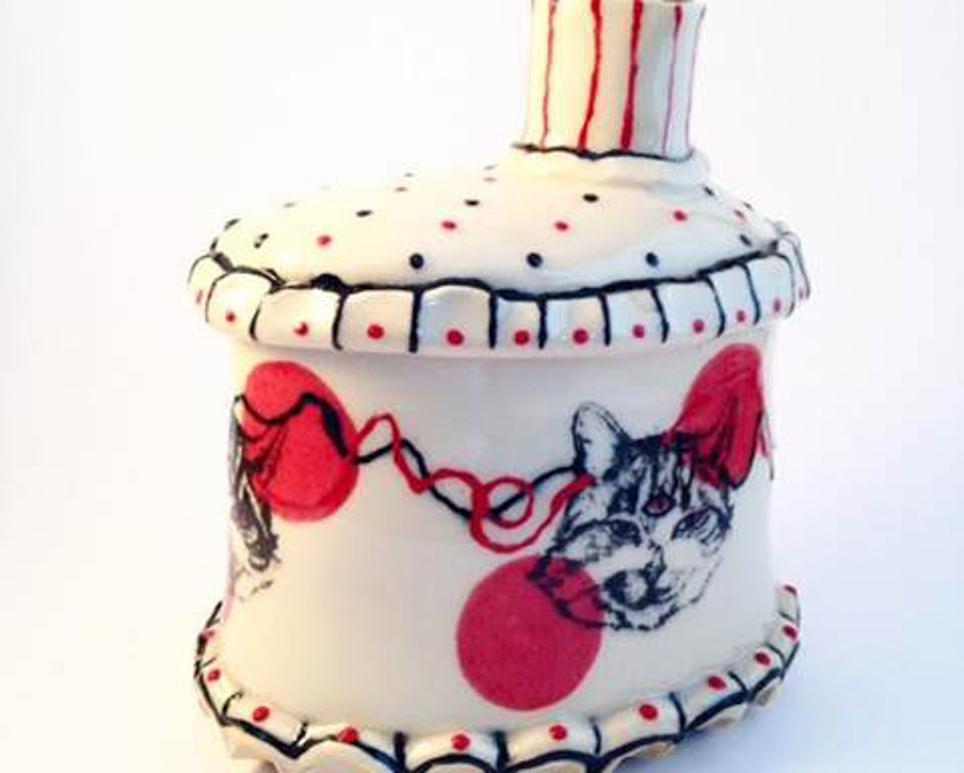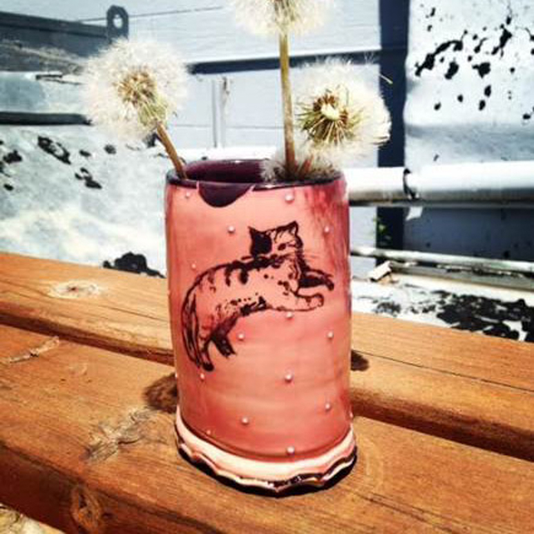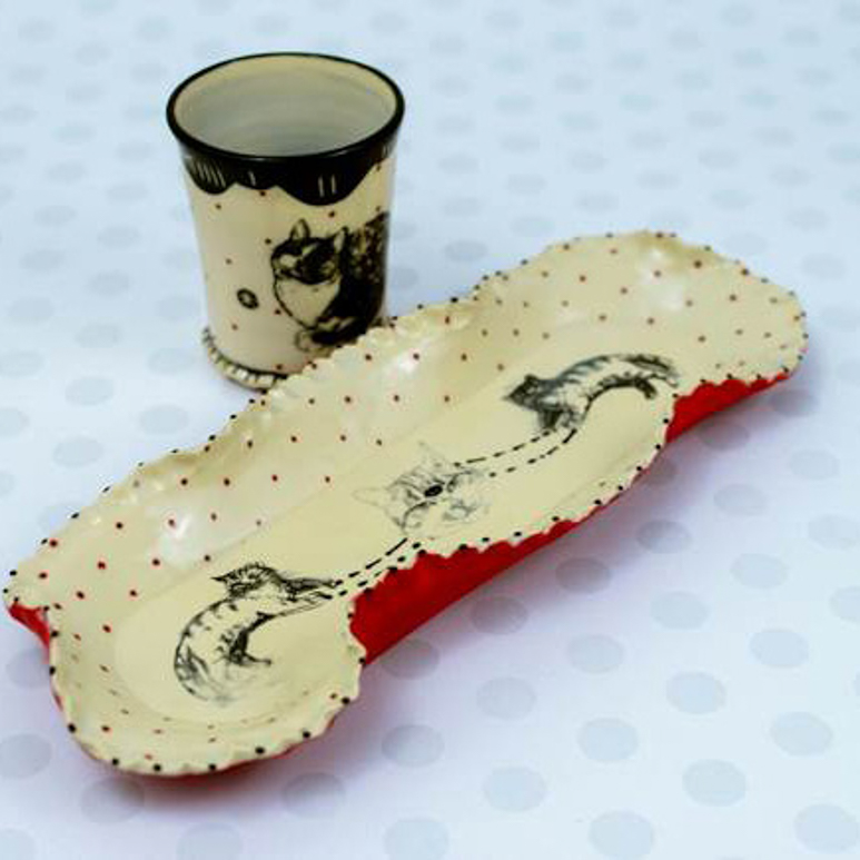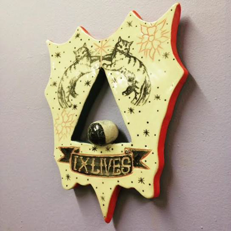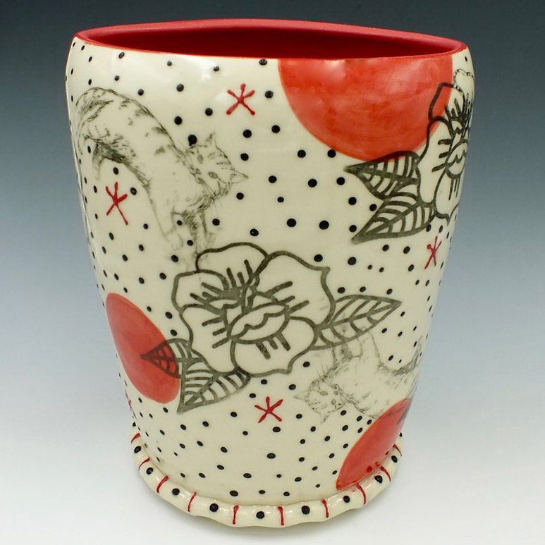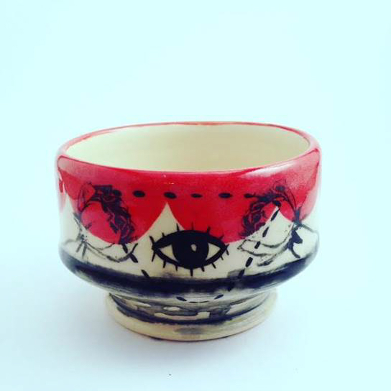 My biggest inspiration is american traditional tattoos. I am constantly looking at work from old and new artists. I think that with every tattoo, just like every pot, there is a very specific story that can be interpreted in multiple ways. The rich history and lore that comes out of the tattoo tradition always keeps me exited! Stylistically, I love the use of bold lines, limited color, and clear imagery. I have always found so many similarities between tattoos and ceramics that it just makes sense. I am also inspired by printmaking, american folk art, divination practices, and of course animals, especially cats!