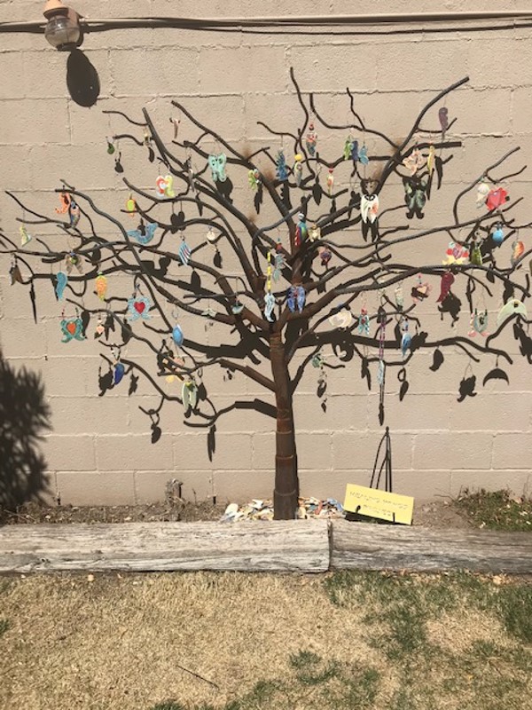 The Healing Wings Project began as a way to remember those lost during the COVID-19 pandemic. Each wing is clay bisque that those in the community can paint. The wings are fired and then hung on a tree mural located within the community.