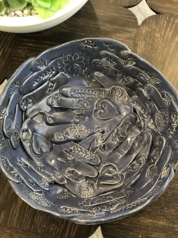 I started making handprint bowls 12 years ago. I met a mom that had a very sick child and he was believed to be terminal. She asked what I could create for her, to remember him. She had already made many PYOP projects with his handprints and foot prints. I asked her if she would let me trace his hand and come up with a clay project that would memorialize his sweet hand size. I came up with a bowl that was made from his hand tracings and stamped with his name and year. She loved it so much, she ordered two more for the grandmothers. I thought other families would also love these sweet bowls and I started offering them in my studio. That same mother still brings her now 14 year old boy to my studio each year, so I can celebrate in his recovery and his now healthy life.